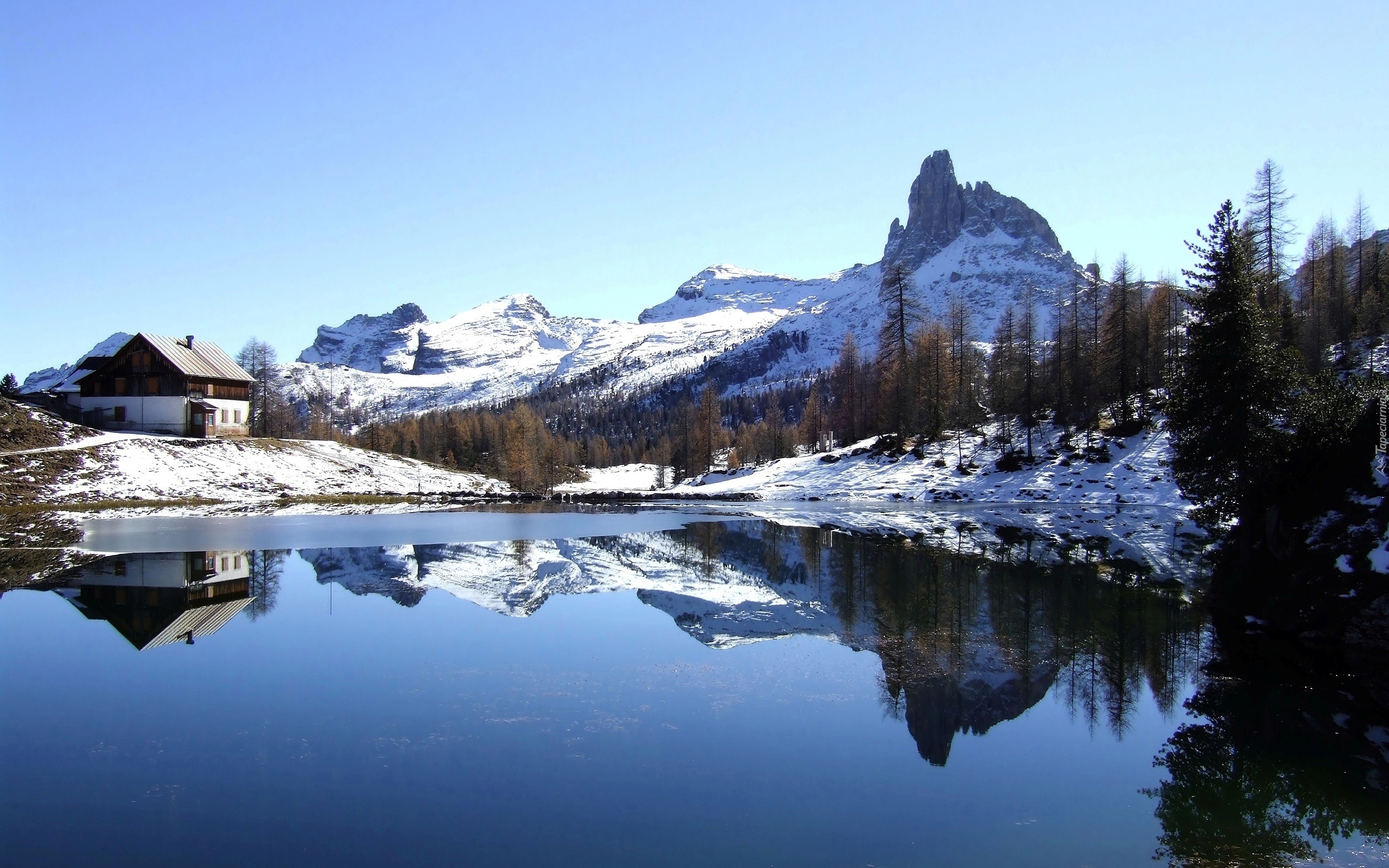 Edytor tapety: Jezioro, Domek, Drzewa, Wzgórza
