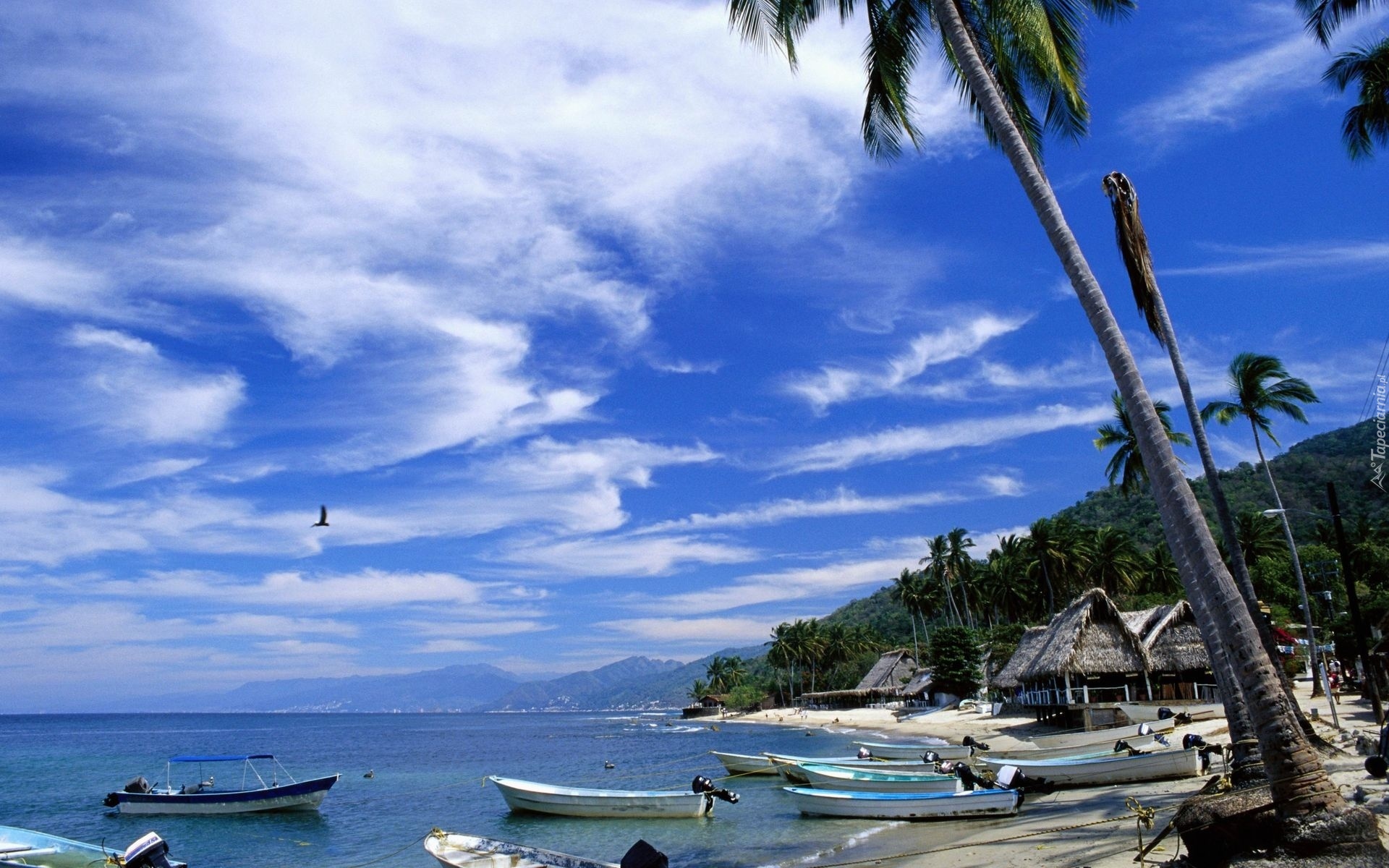 Edytor tapety: Morze, Łodzie, Domki, Palmy