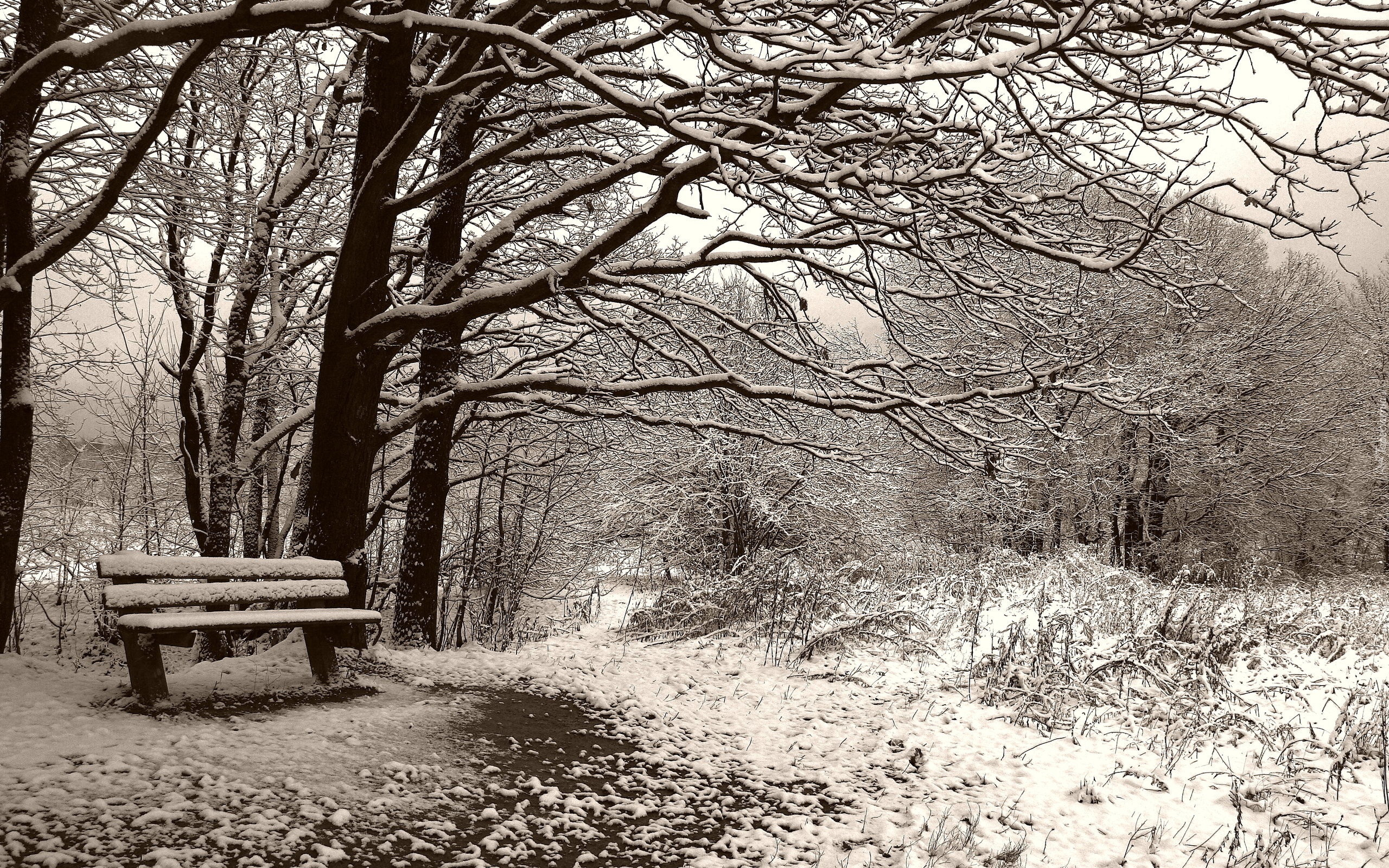 Edytor tapety: Ławka, Las, Śnieg, Mróz, Trawa