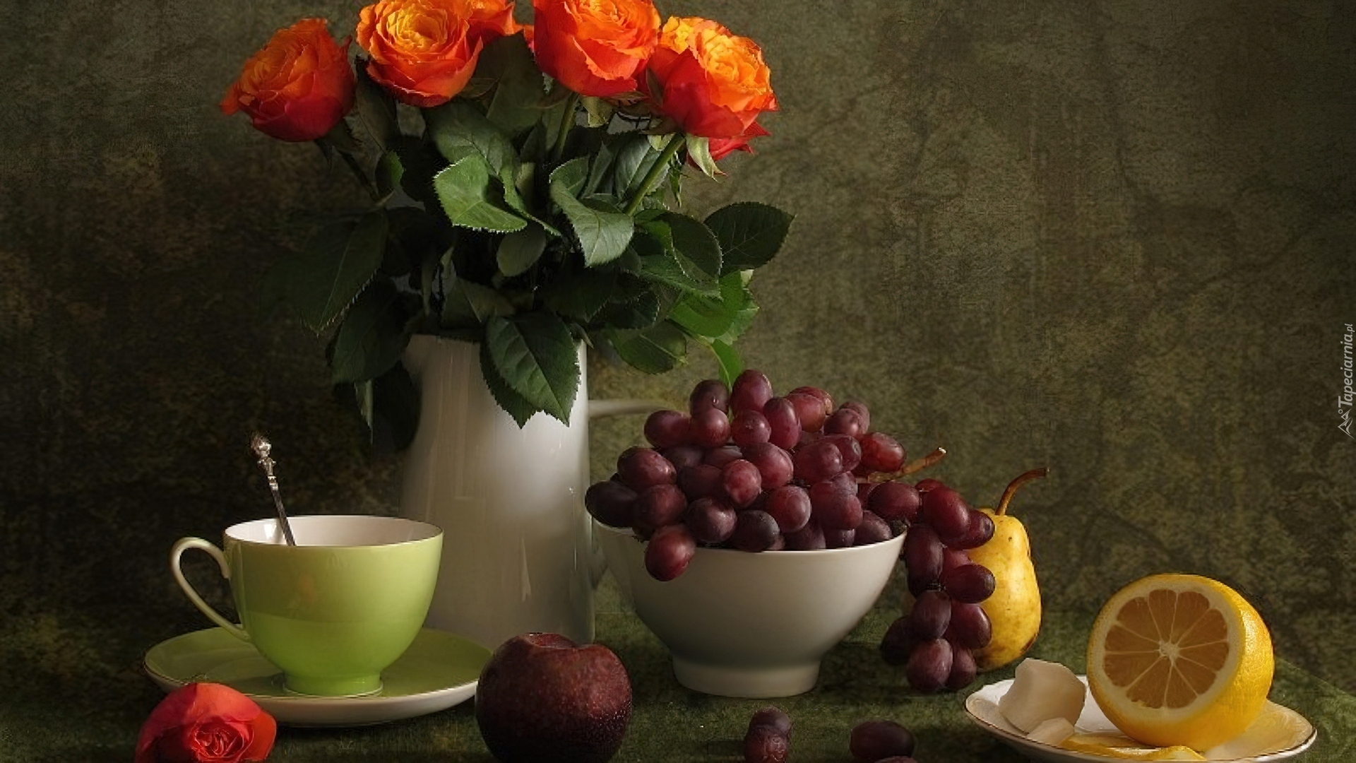 Edytor tapety: Bukiet, Róż, Winogrona, Cytrynki, Filiżanka