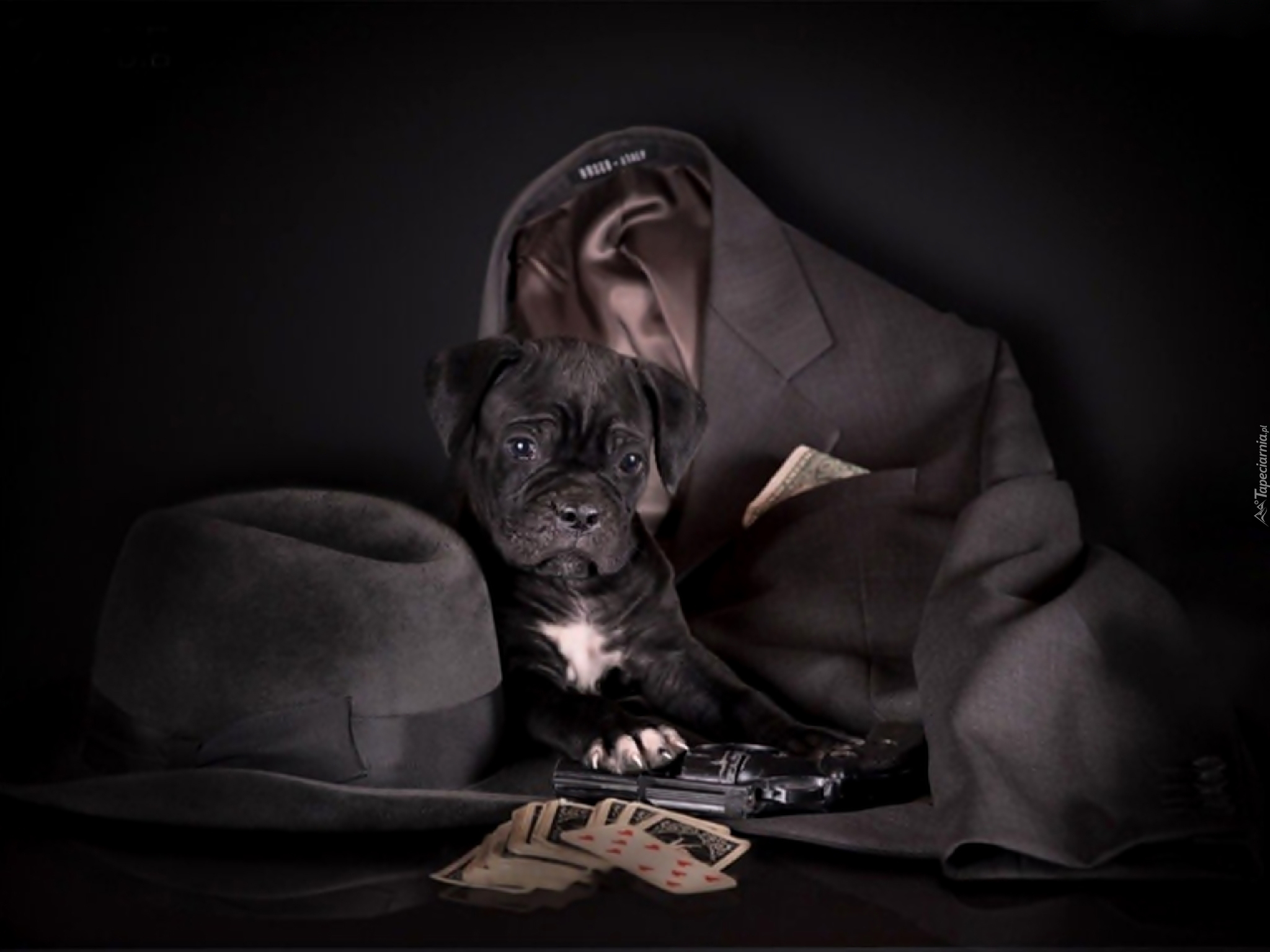 Edytor tapety: Szczeniak, Kapelusz, Marynarka, Pistolet, Karty