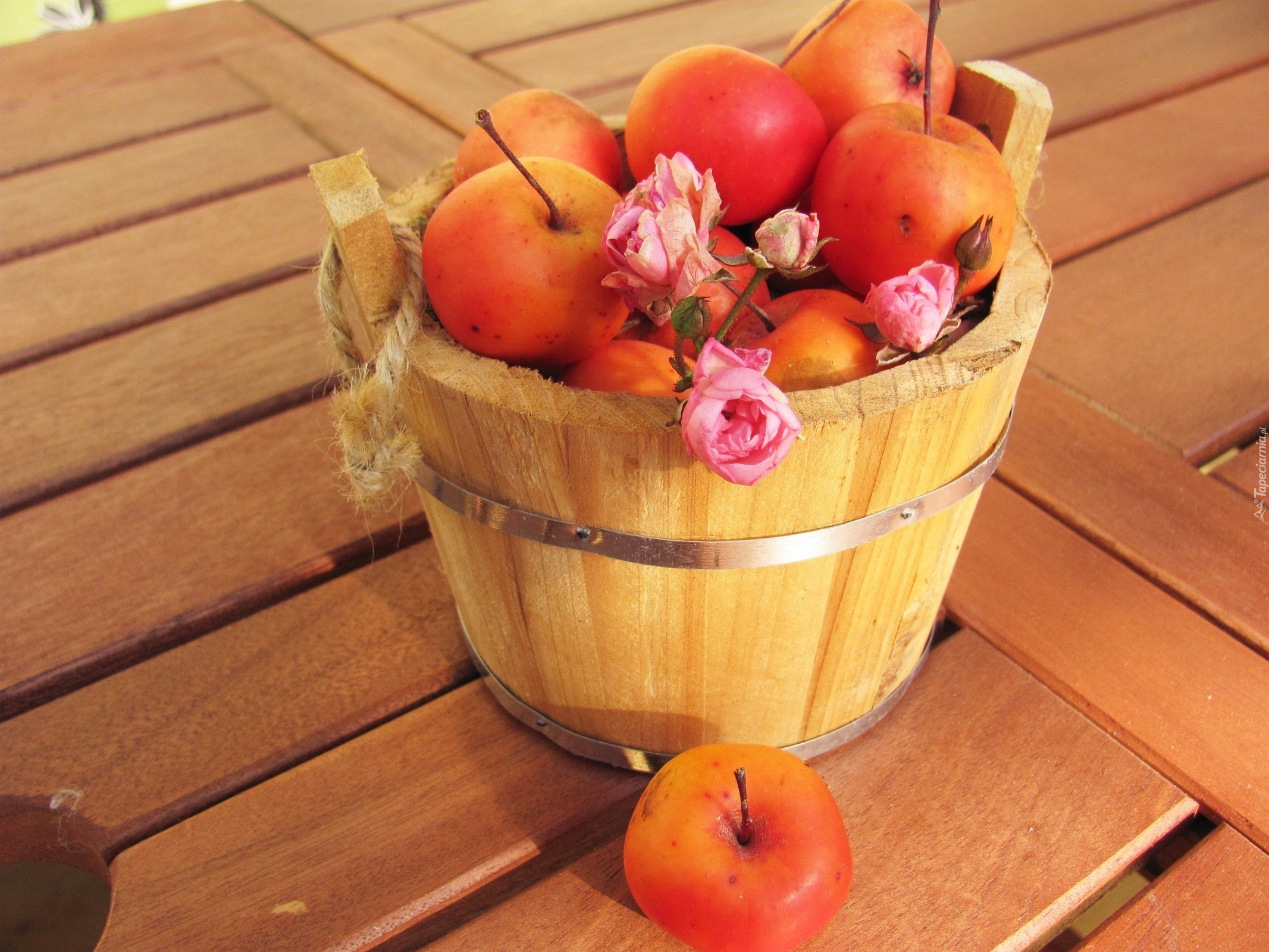Edytor tapety: Drewniany, Ceberek, Jabłka, Różyczki