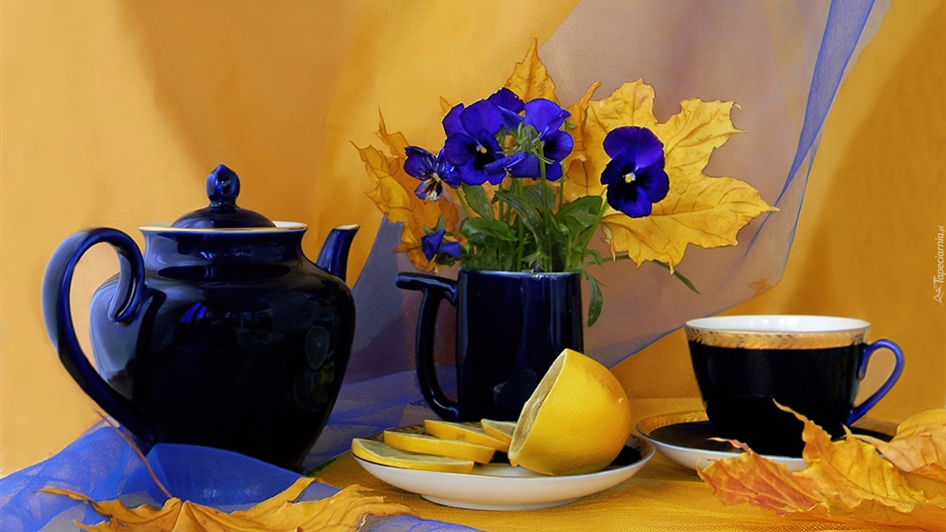 Edytor tapety: Herbatka, Czajniczek, Bratki, Cytrynka