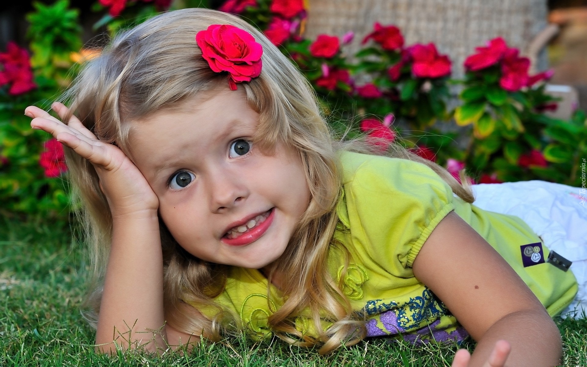 Edytor tapety: Leżąca, Dziewczynka, Ogród, Kwiaty