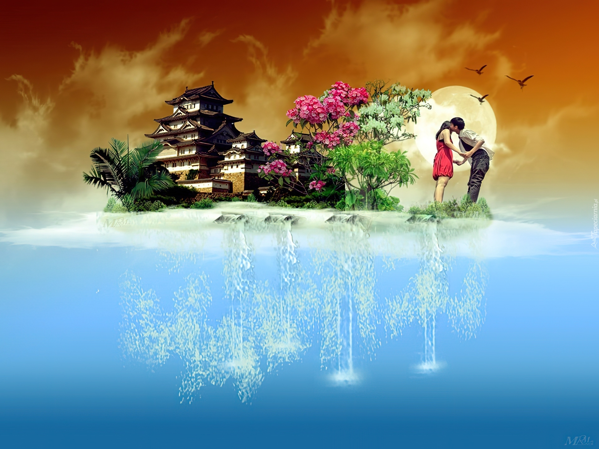 Edytor tapety: Miłość, Kwiaty, Pagoda, Morze