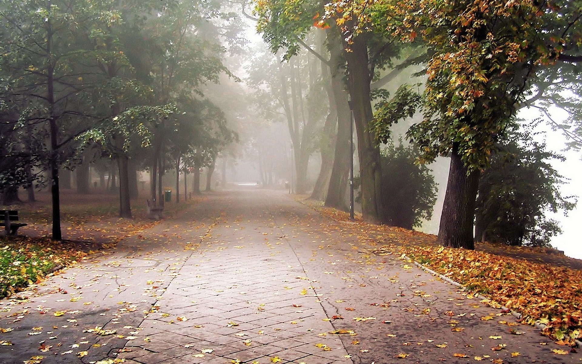 Edytor tapety: Park, Chodnik, Drzewa, Ławki, Liście, Mgła