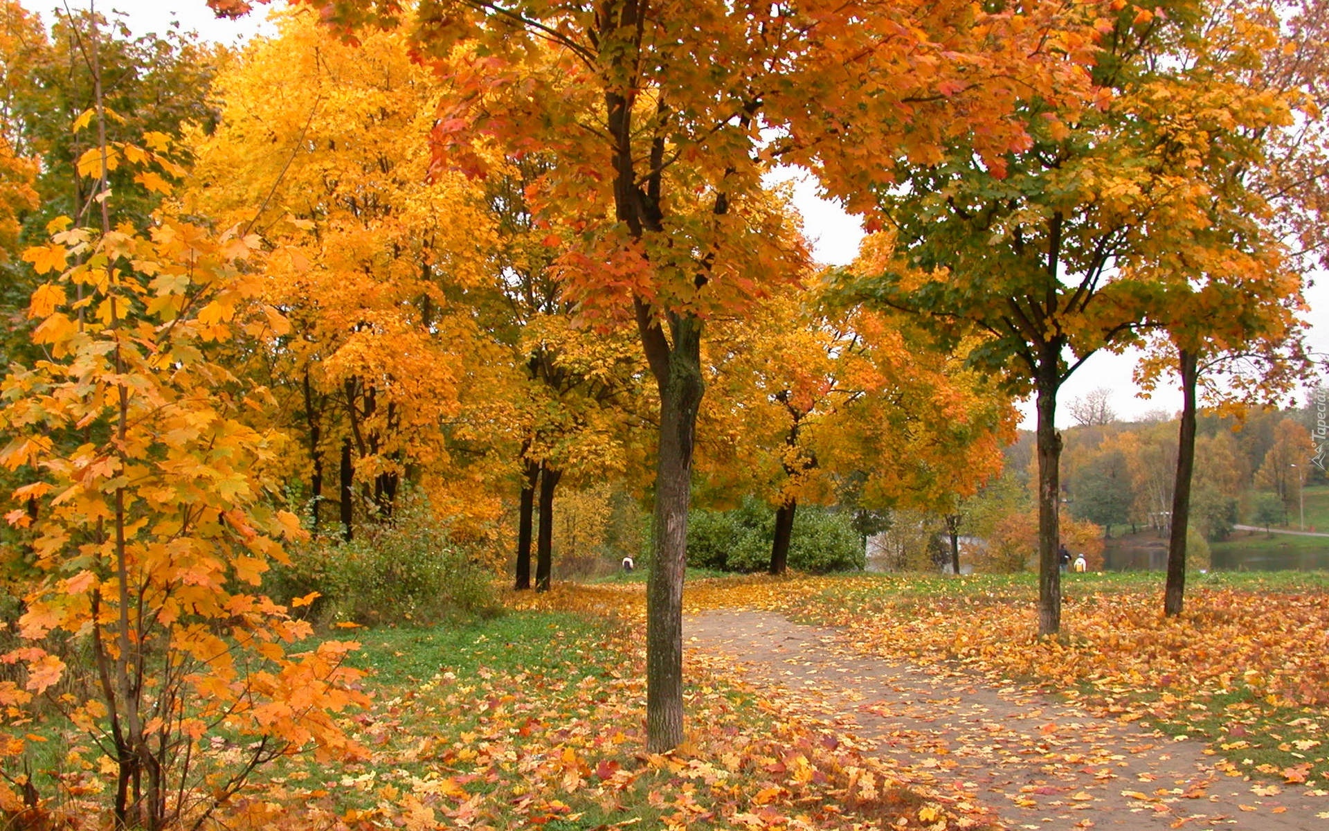 Edytor tapety: Ścieżka, Drzewa, Liście, Jezioro