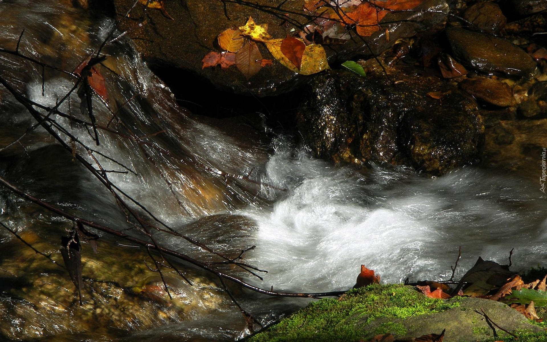 Edytor tapety: Rwący, Potok, Kamienie, Gałęzie