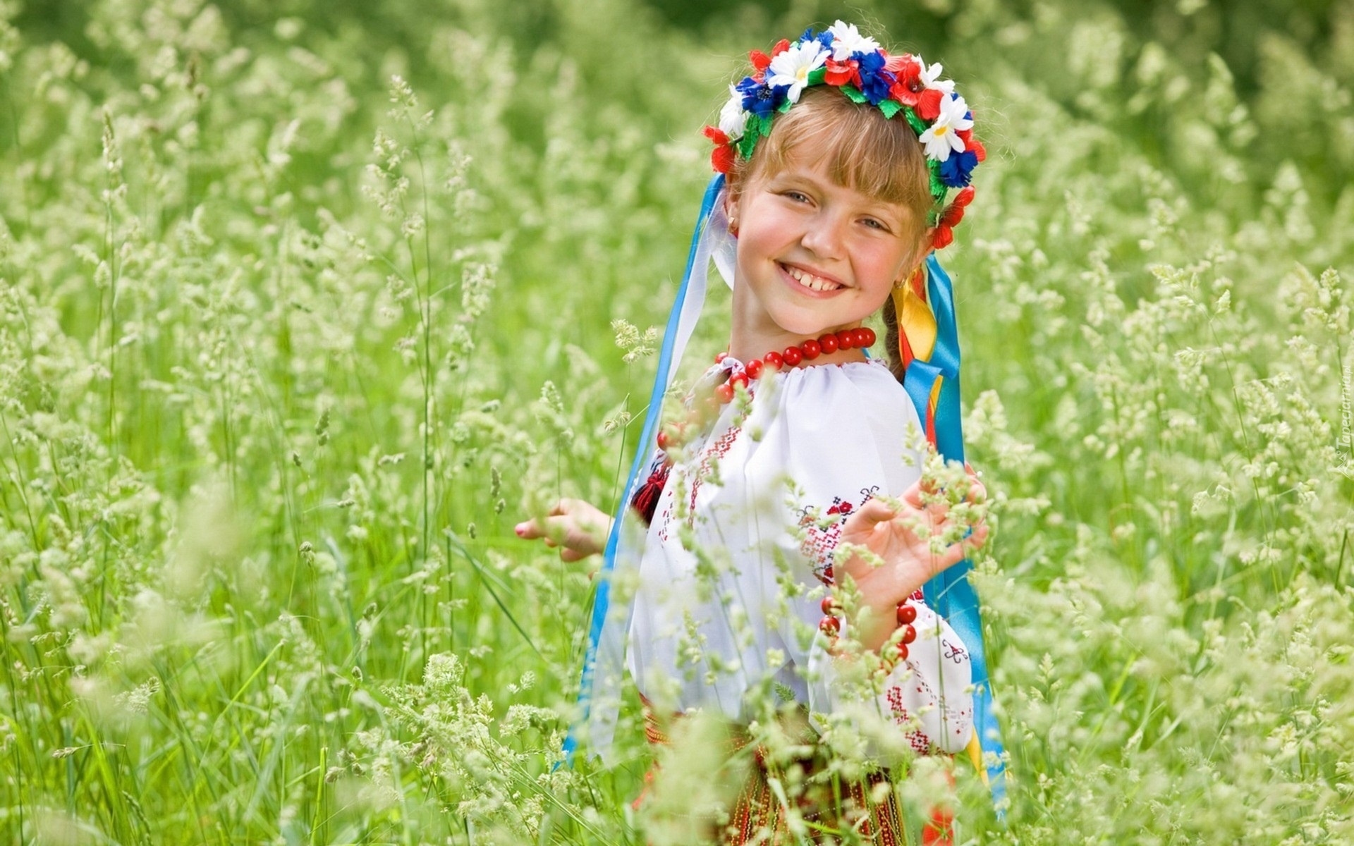 Edytor tapety: Roześmiana, Dziewczynka, Wianek, Łąka