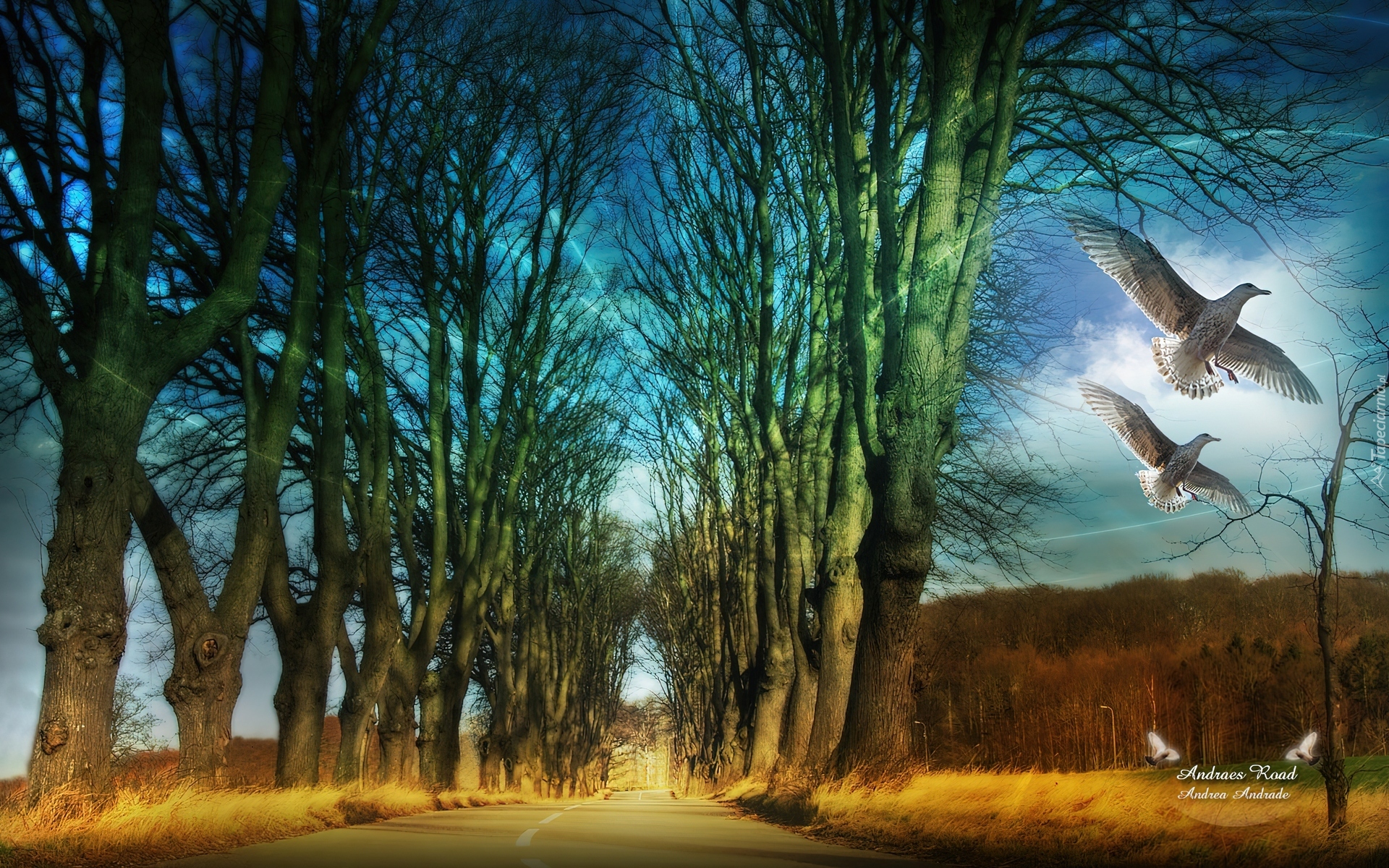 Edytor tapety: Droga, Alejka, Drzew, Ptaki
