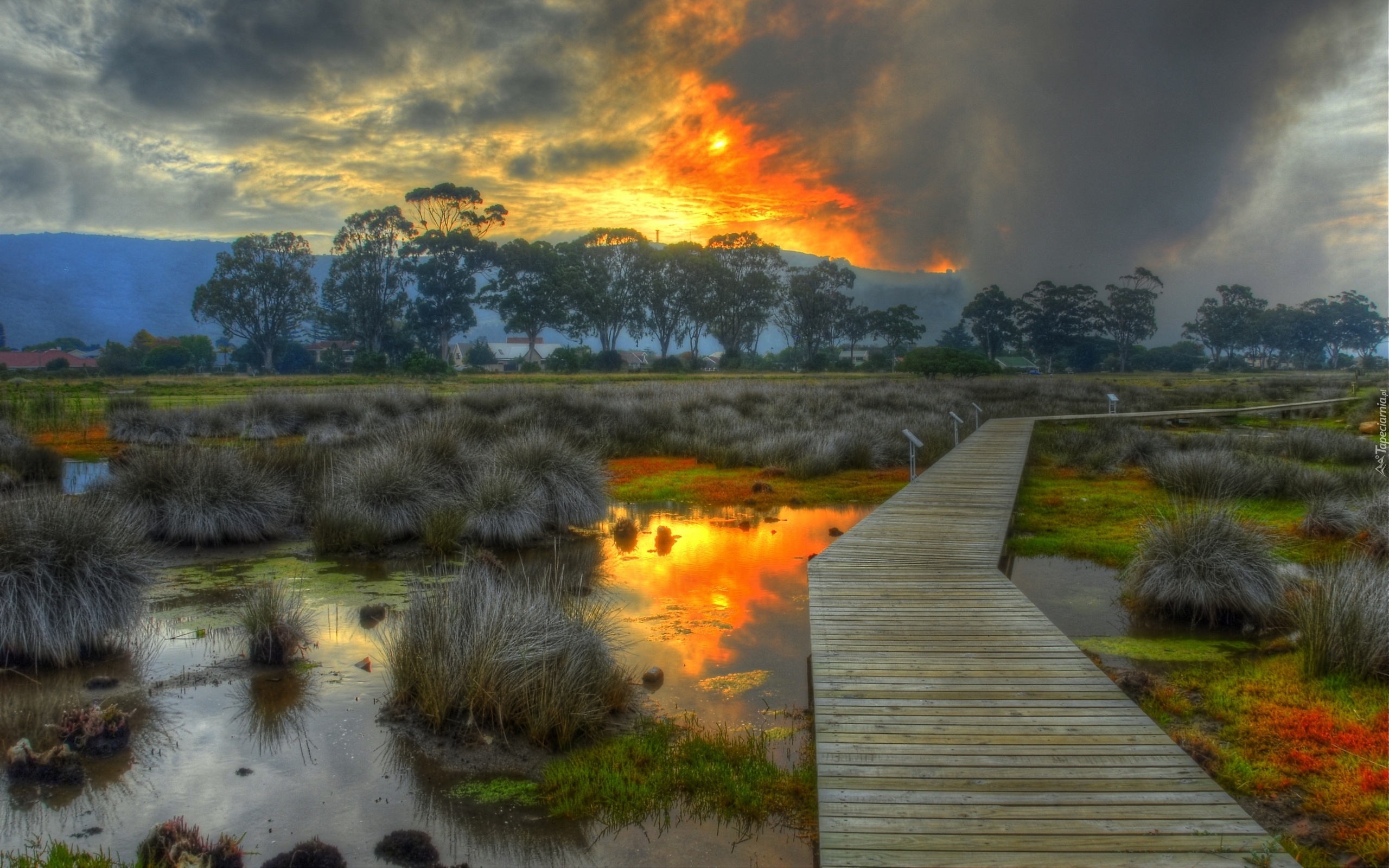 Edytor tapety: Kładka, Przez, Bagno, Zachodzące, Słońce