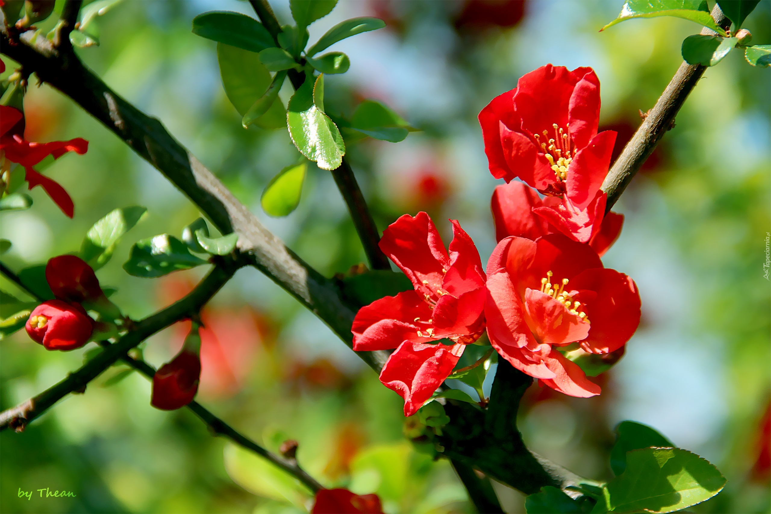 Edytor tapety: Kwitnący, Krzew, Pigwa, Czerwone, Kwiaty