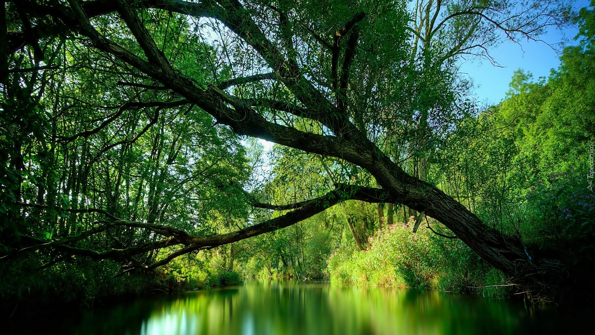 Edytor tapety: Rzeka, Zarośla, Pochylone, Drzewo