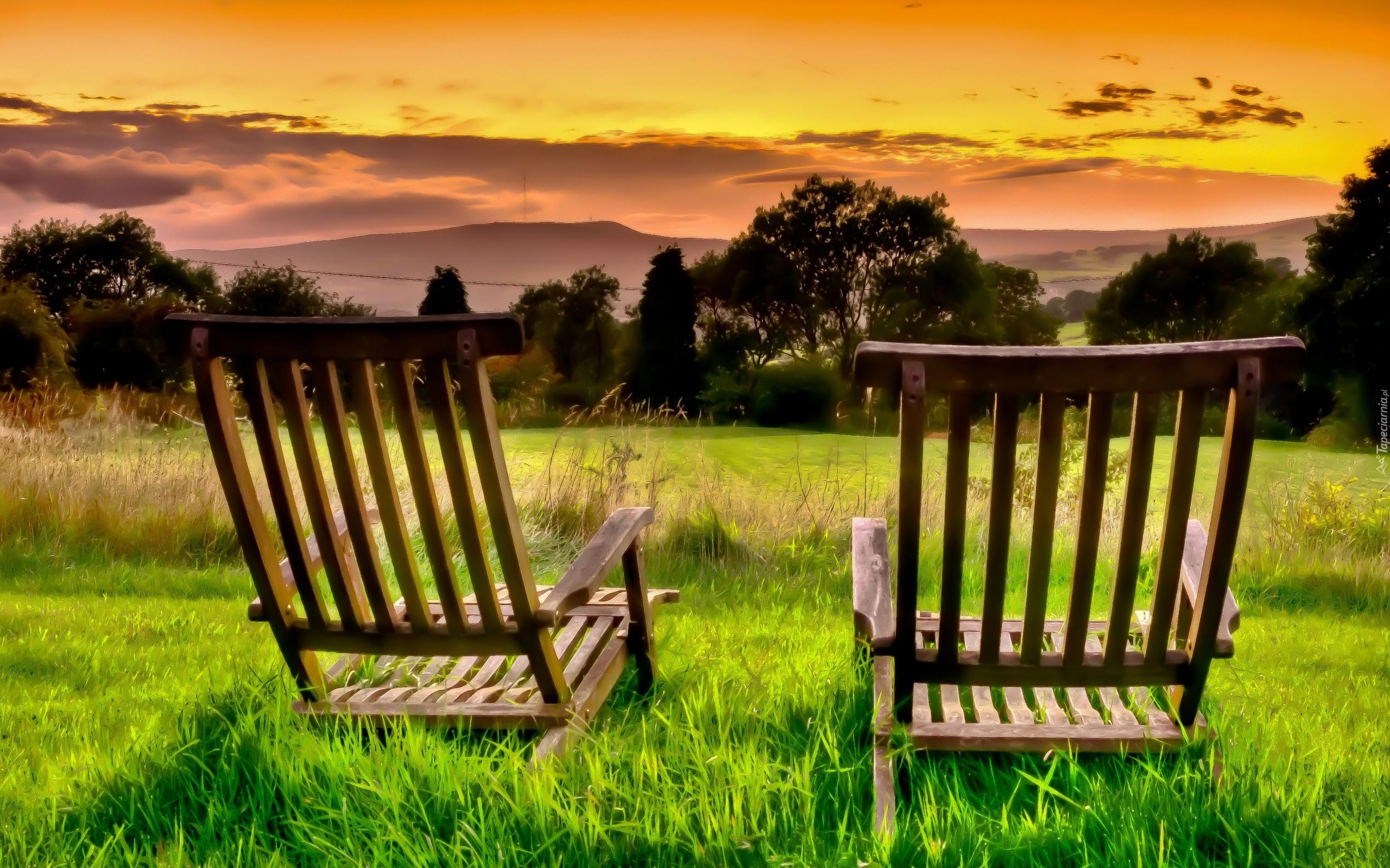 Edytor tapety: Zachód, Słońca, Łąka, Dwa, Fotele