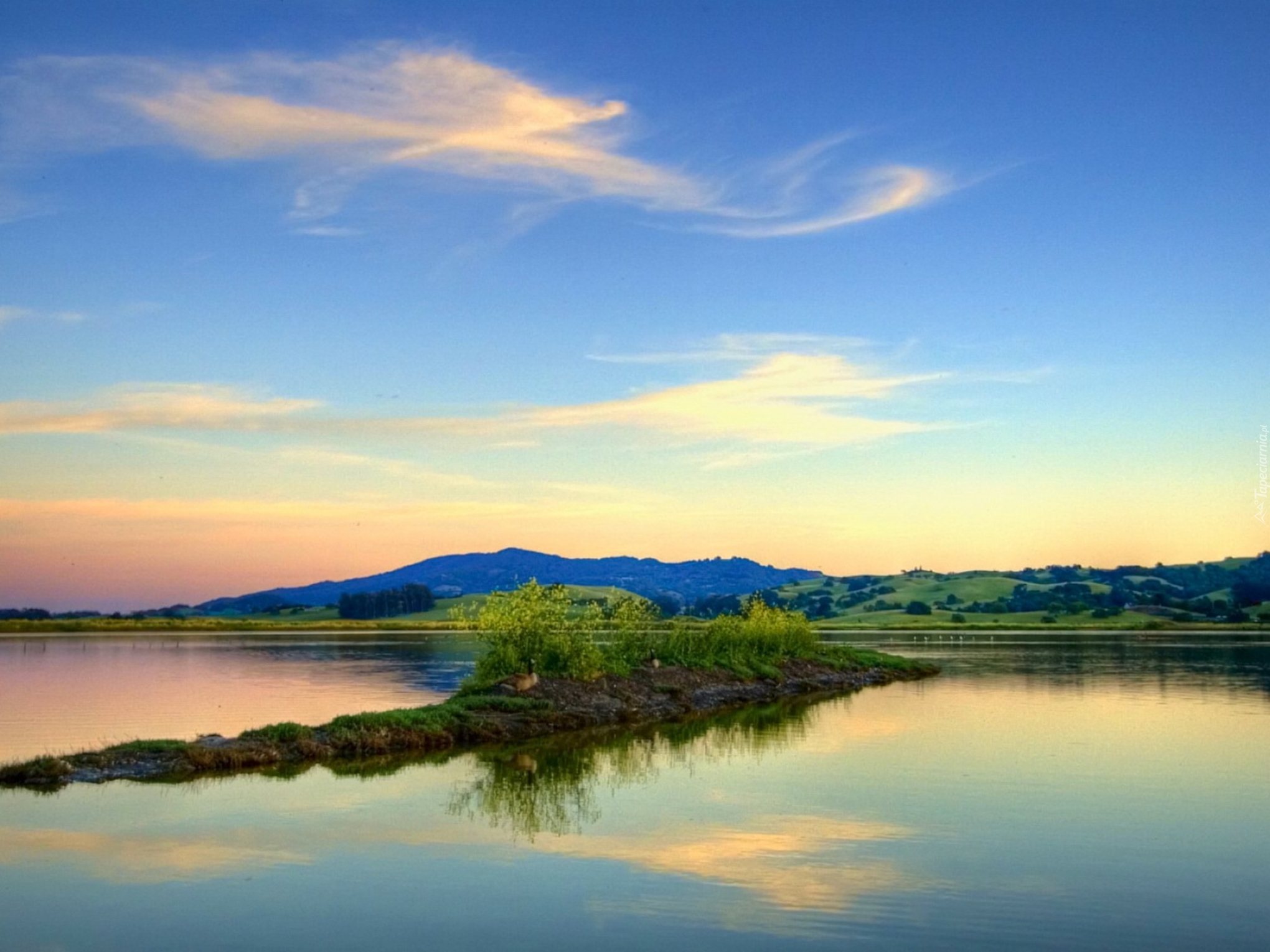 Edytor tapety: Jezioro, Wysepka, Zachód, Słońca