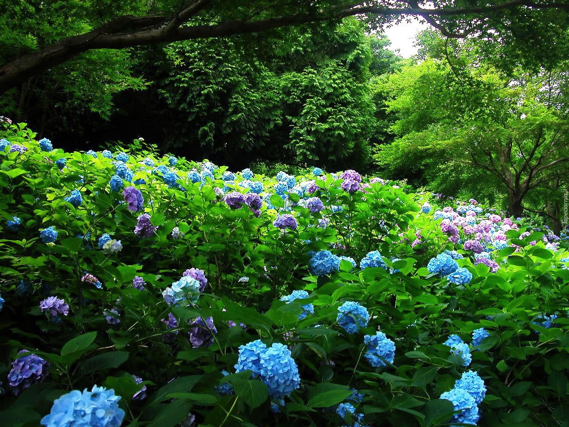 Edytor tapety: Ogród, Hortensja, Niebieska, Różowa, Drzewa