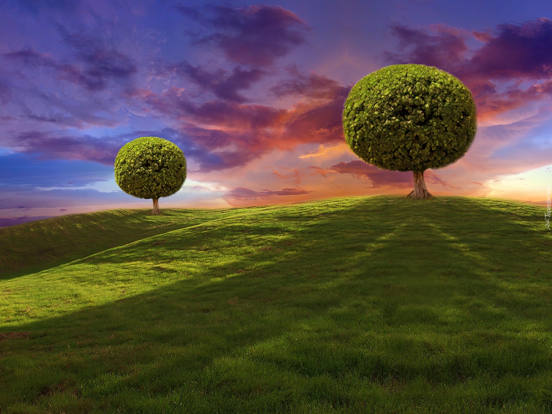 Edytor tapety: Zachód, Słońca, Drzewa, Łąka