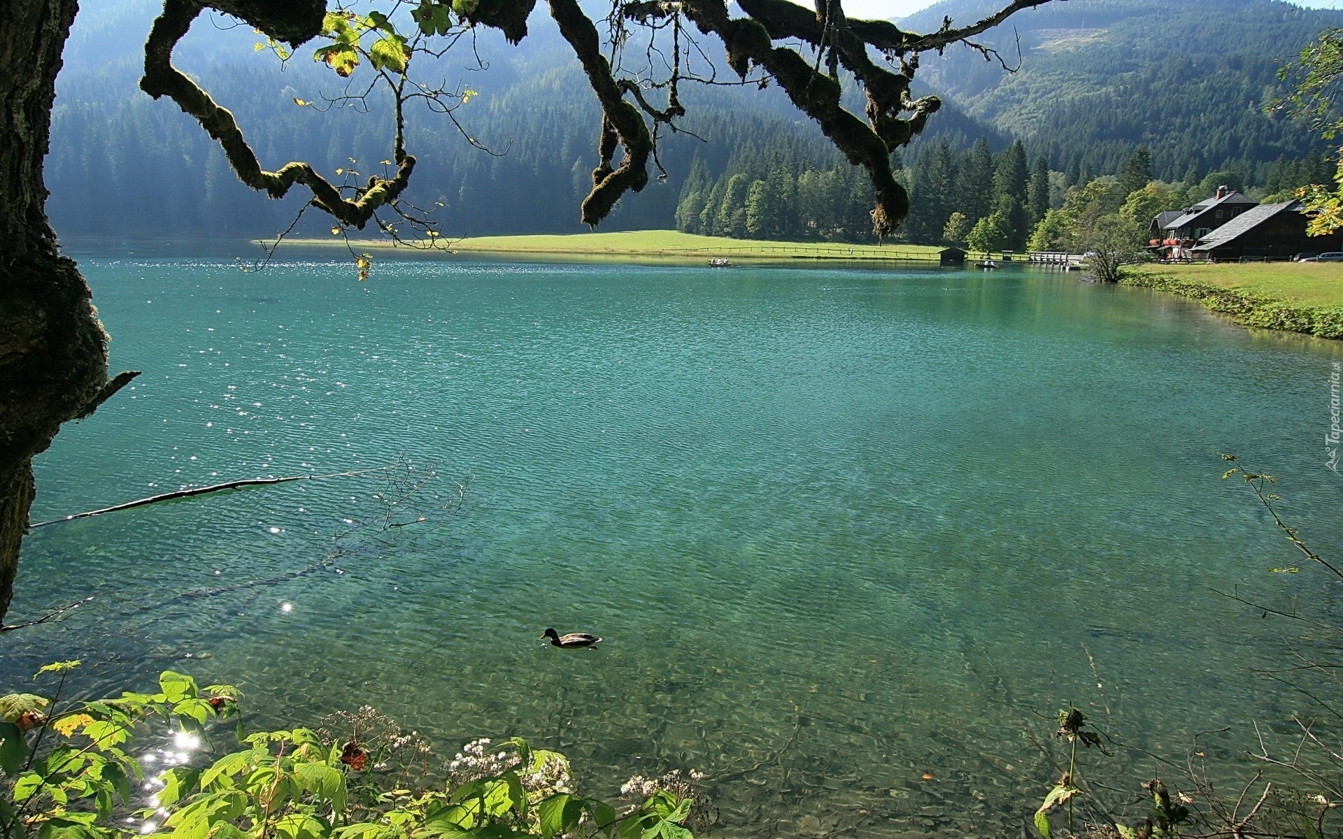 Edytor tapety: Staw, Góry, Drzewa, Kaczka