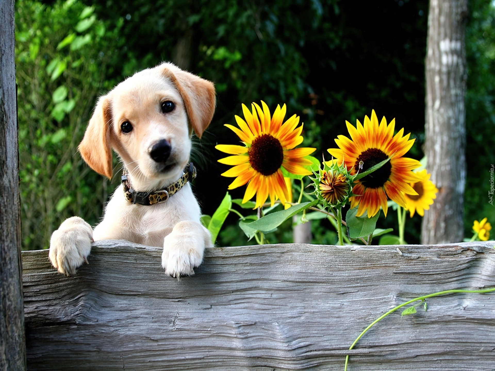 Edytor tapety: Piesek, Słoneczniki, Labrador Retriever