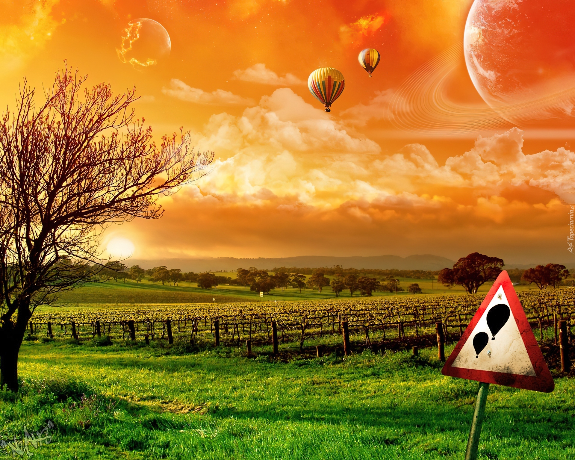 Edytor tapety: Zachód, Słońca, Pola, Balon, Znak