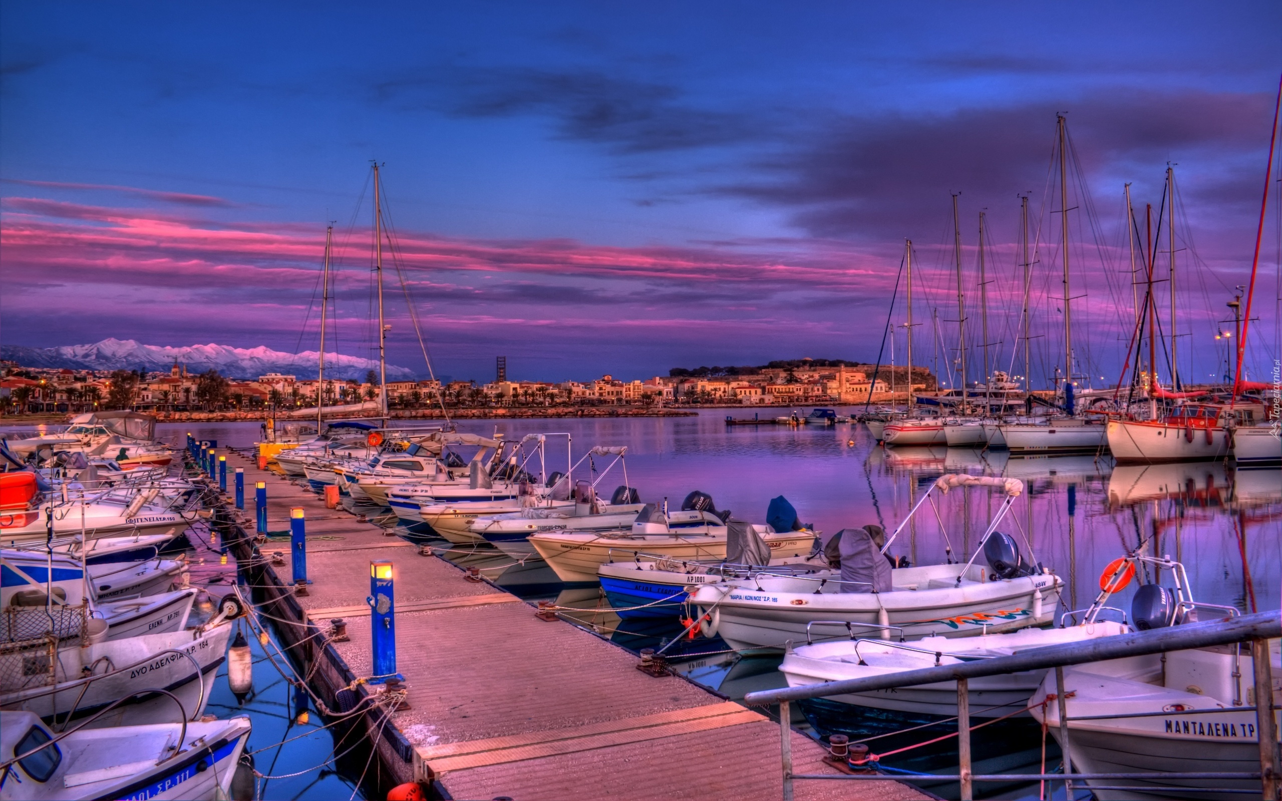Edytor tapety: Zachód słońca, Przystań, Żaglówki, Motorówki