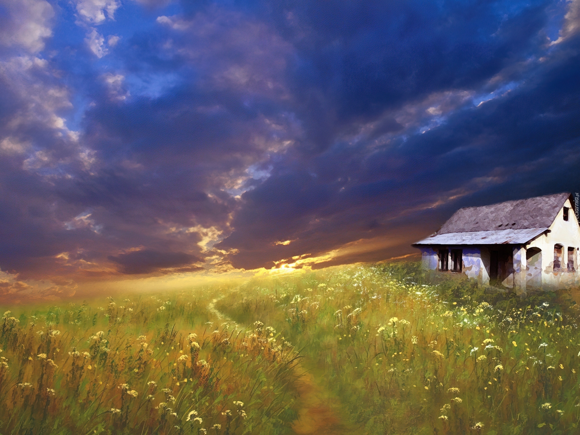Edytor tapety: Zachód, Słońca, Łąka, Kwiatki, Domek, Art