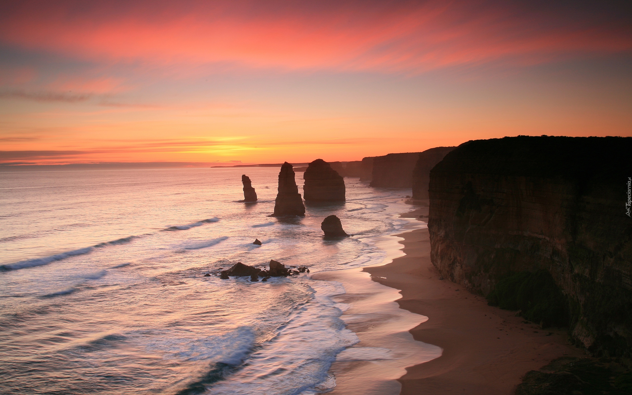 Edytor tapety: Zachód, Słońce, Promienie, Morze, Fale, Skały