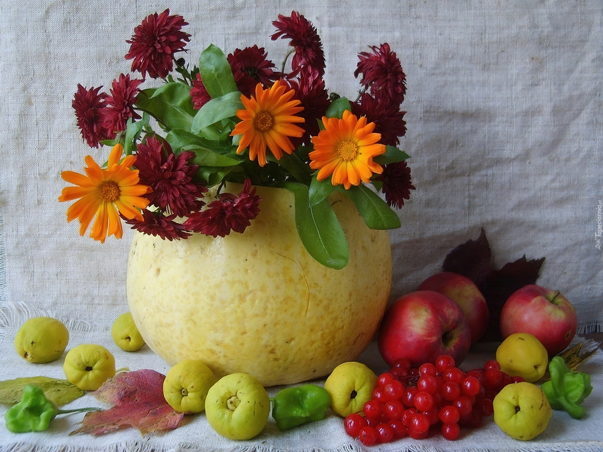 Edytor tapety: Flakon, Kwiaty, Owoce, Pigwy, Jabłka