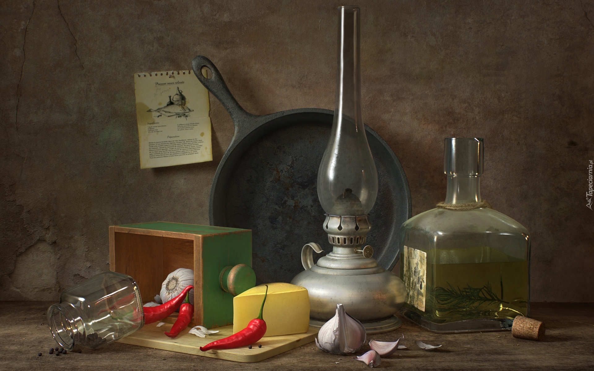Edytor tapety: Kompozycja, Lampa naftowa, Butelka, Warzywa