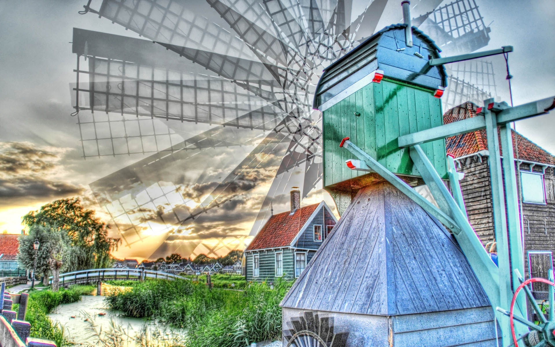 Edytor tapety: Wiatrak, Rzeka, Chmury, Holandia