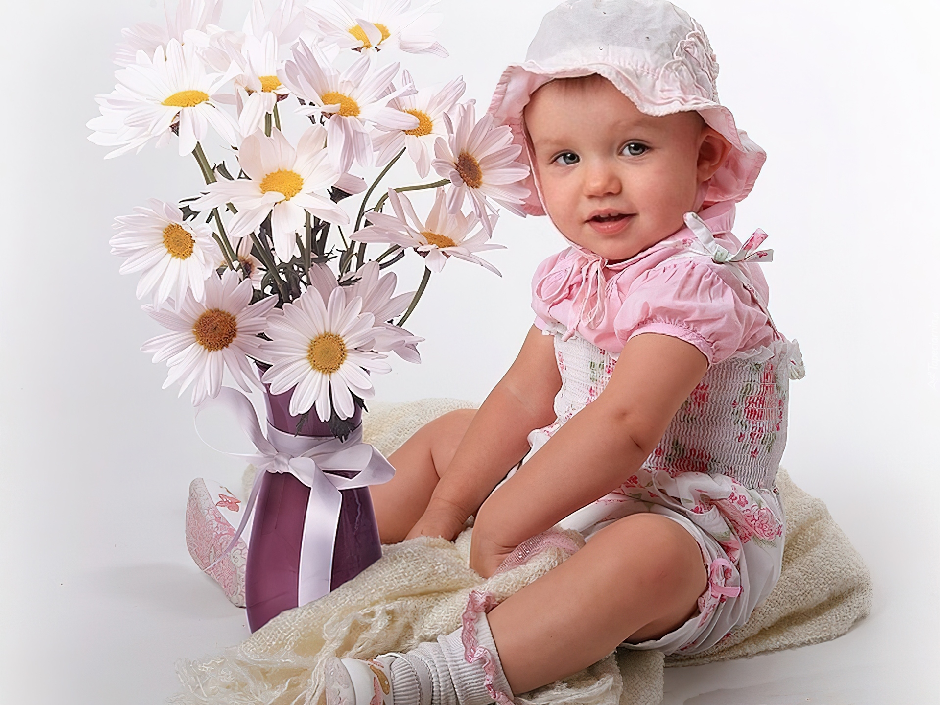 Edytor tapety: Dziewczynka, Margerytki, Wazon