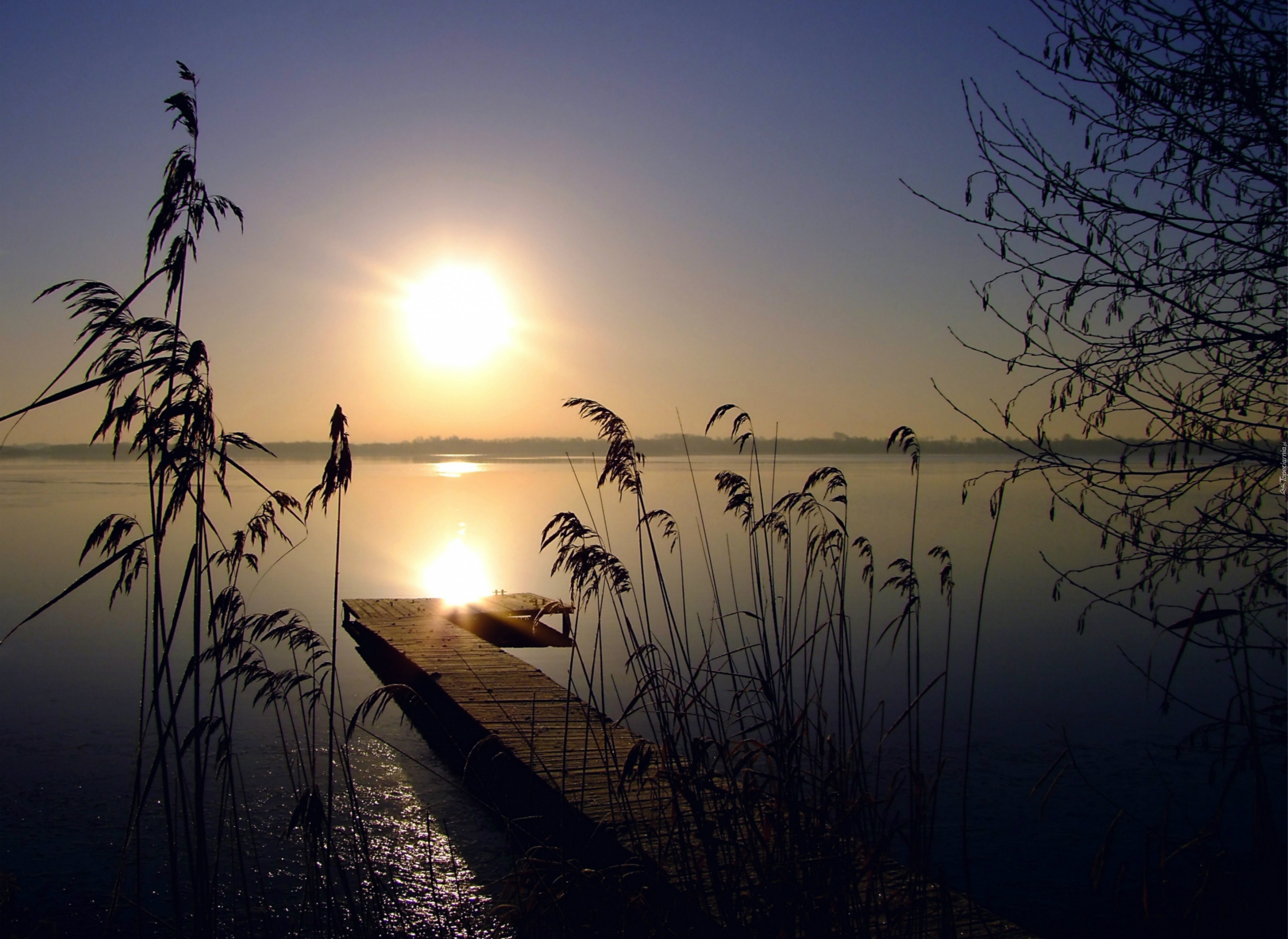 Edytor tapety: Jezioro, Zachód, Słońca, Trawa, Pomost