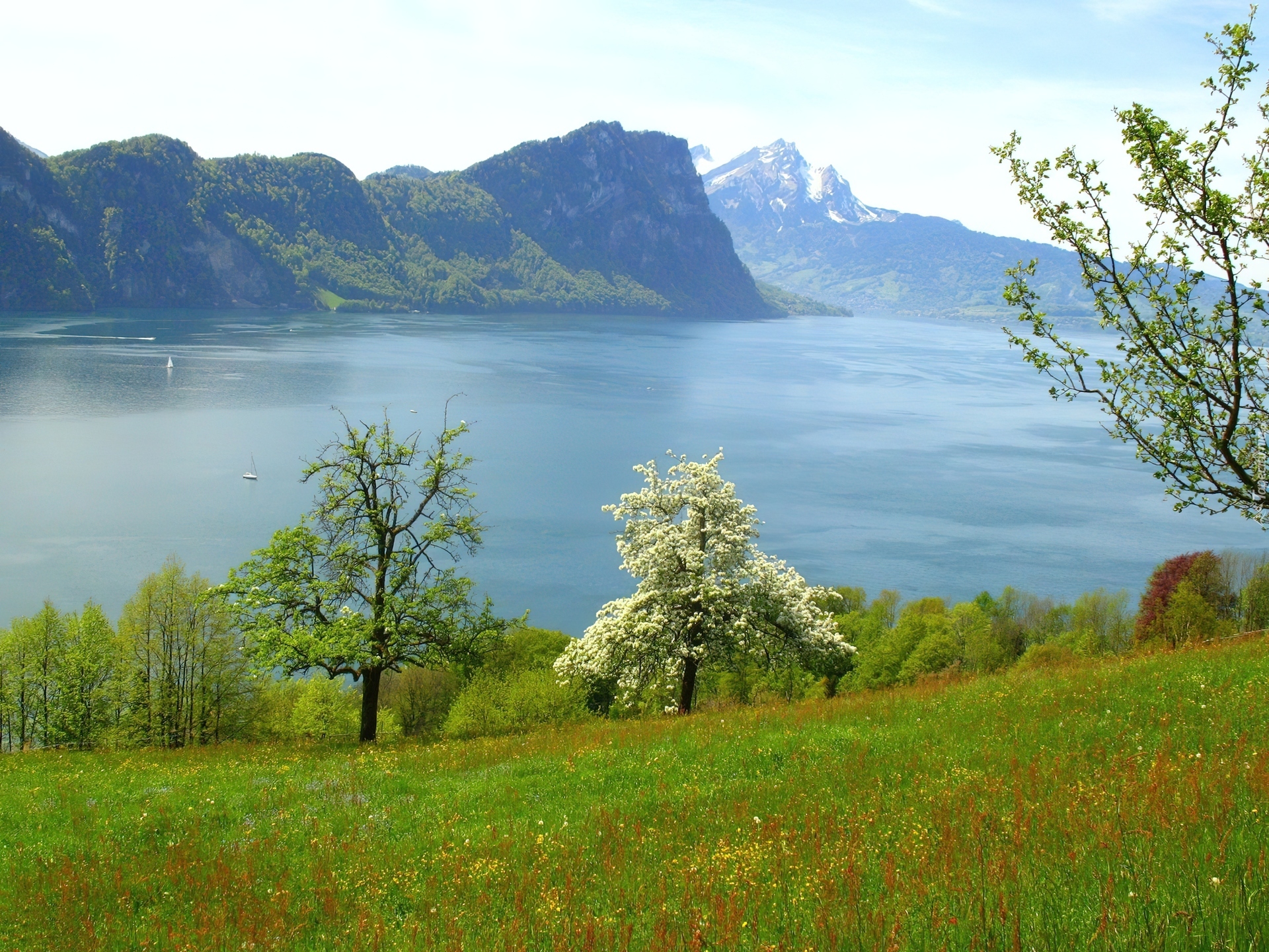 Edytor tapety: Góry, Woda, Łąka, Kwitnące, Drzewo