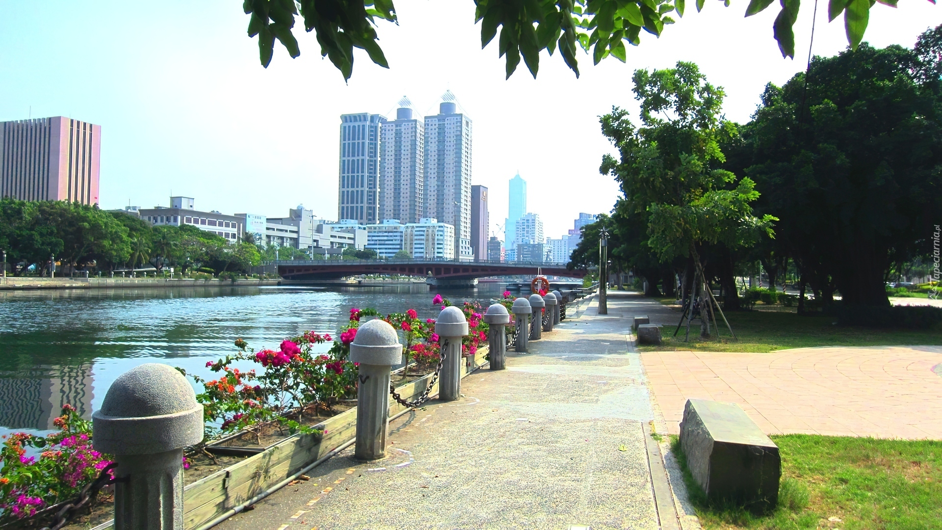 Edytor tapety: Rzeka, Drzewa, Wieżowce