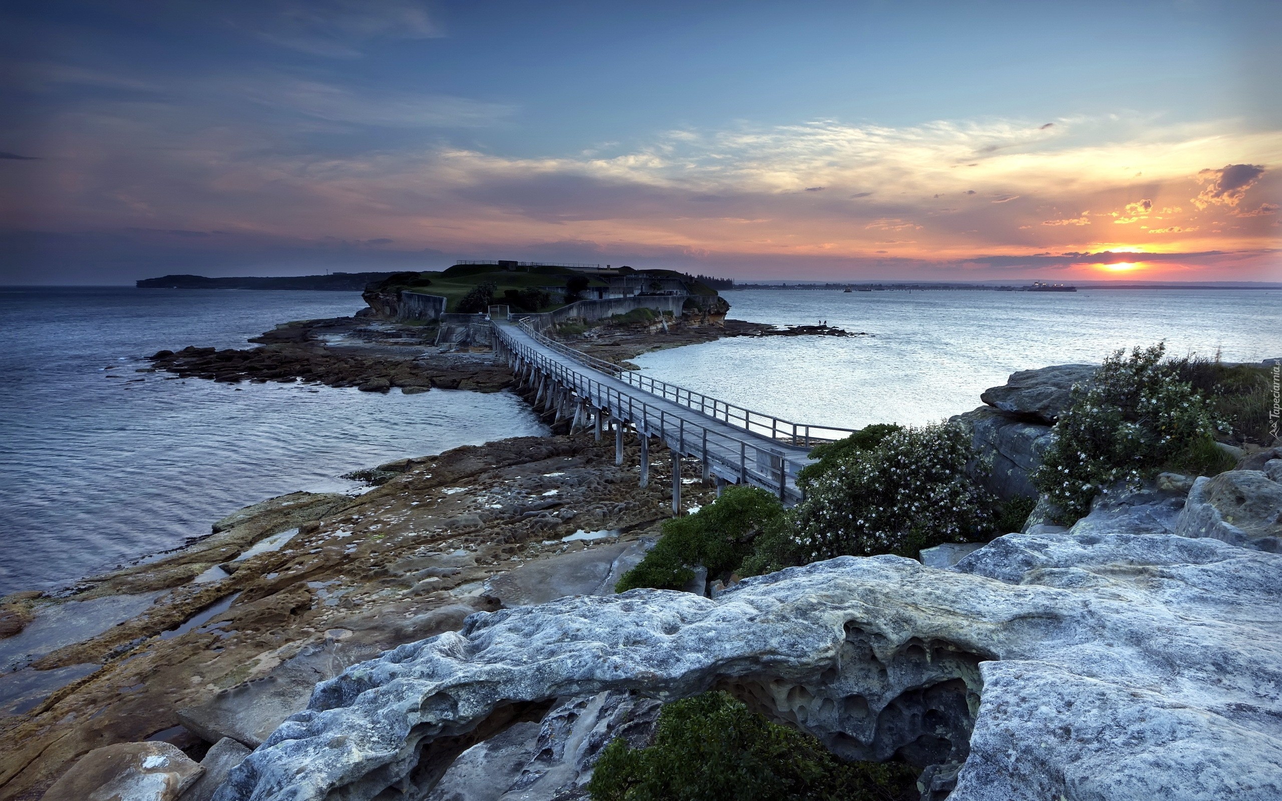 Edytor tapety: Zachód, Słońca, Wybrzeże, Wyspa, Most, Skały