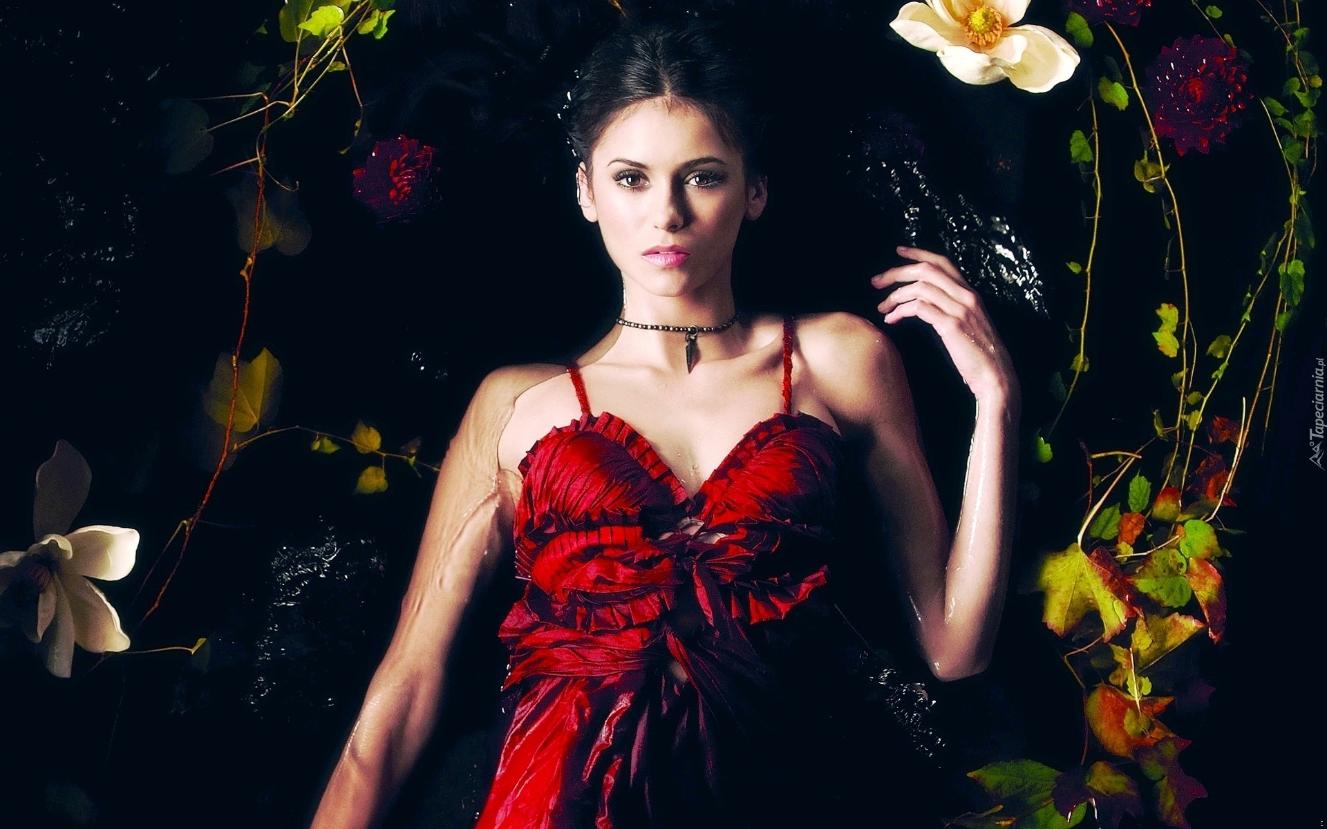 Edytor tapety: Nina Dobrev, Czerwona, Sukienka, Woda, Liście, Kwiaty