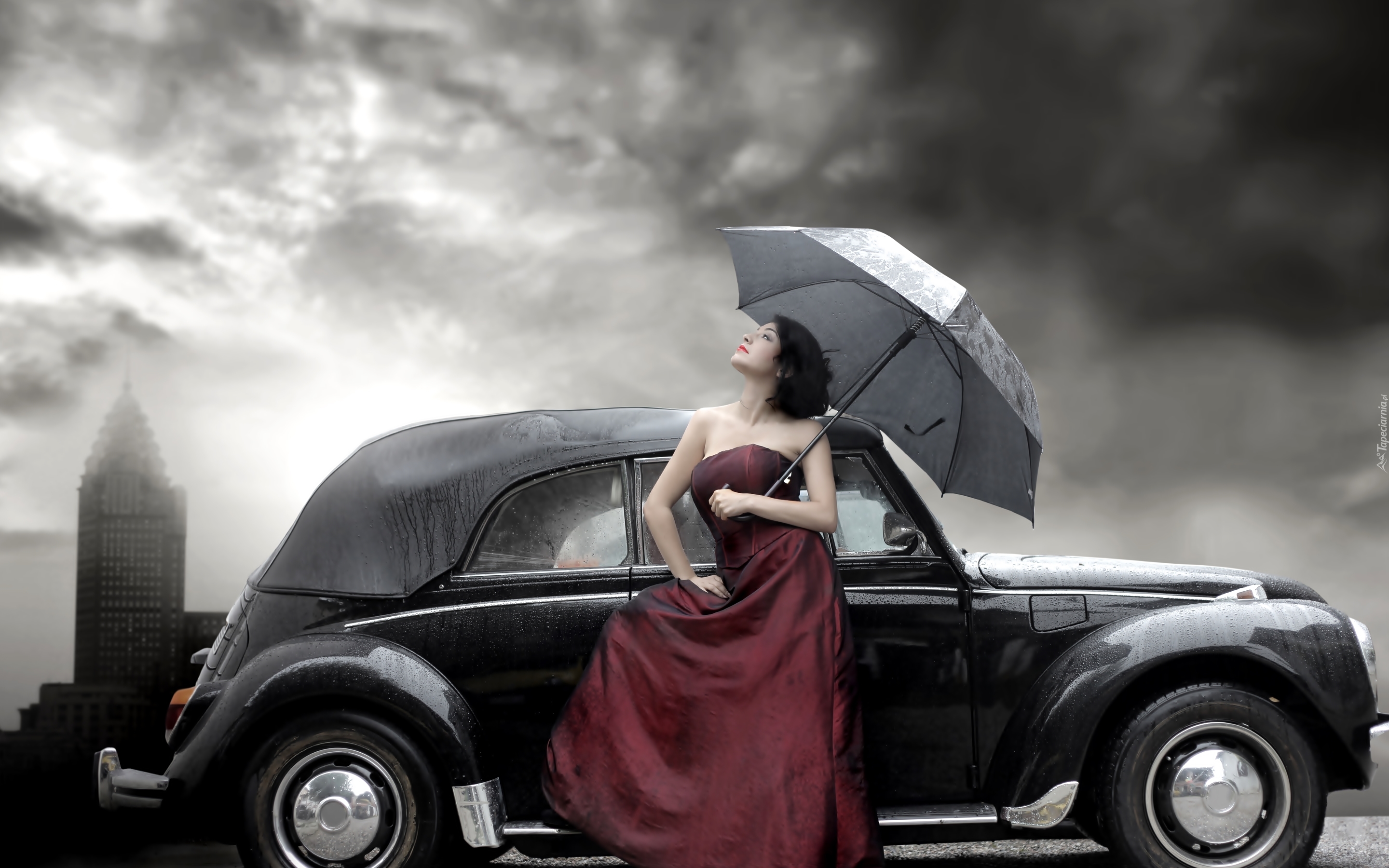 Edytor tapety: Samochód, Klasyk, Kobieta, Parasol