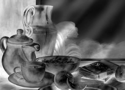 Edytor tapety: Dzbanek, Filiżanka, Książki, Obraz
