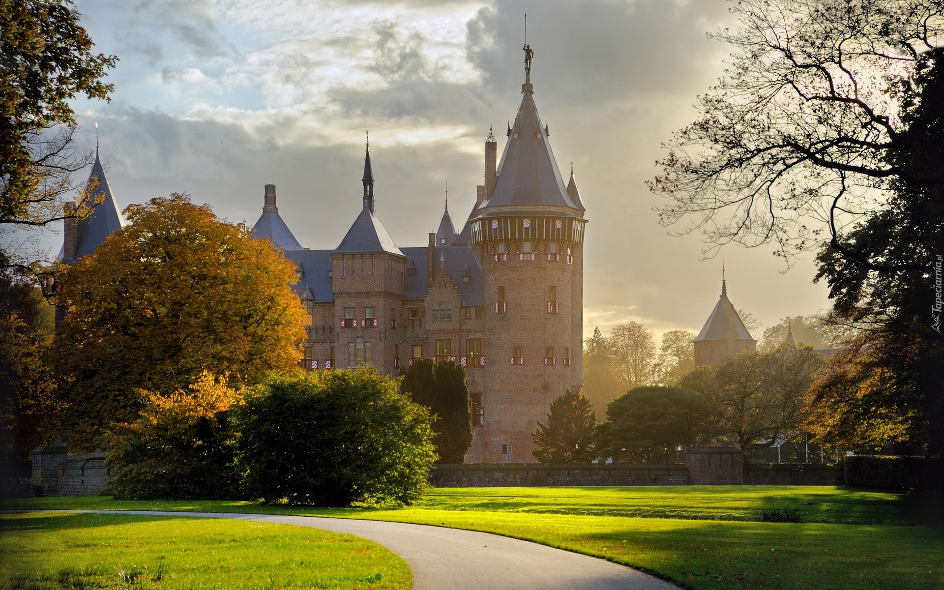 Edytor tapety: Droga, Trawnik, Drzewa, Zamek
