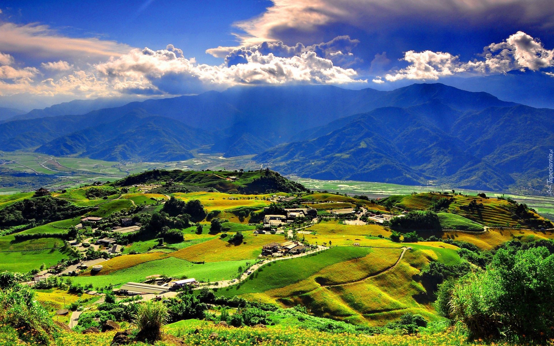 Edytor tapety: Góry, Wioska, Zielone, Pagórki