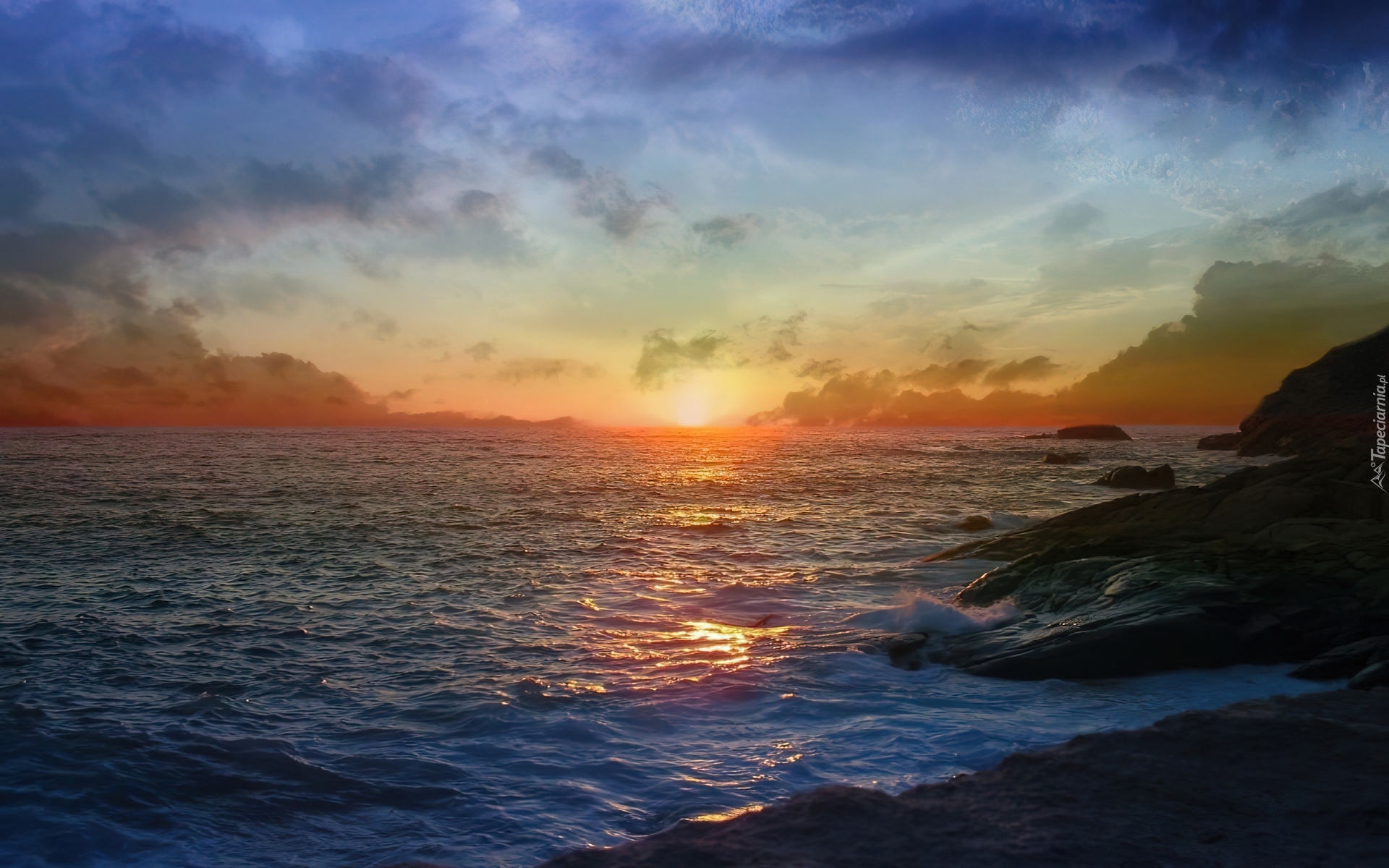 Edytor tapety: Zachód, Słońca, Morze, Skałki