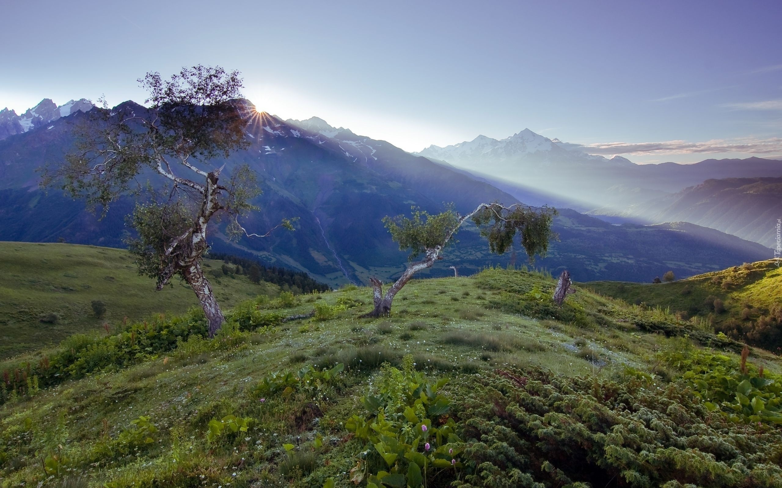 Edytor tapety: Góry, Drzewa, Promienie, Słońca