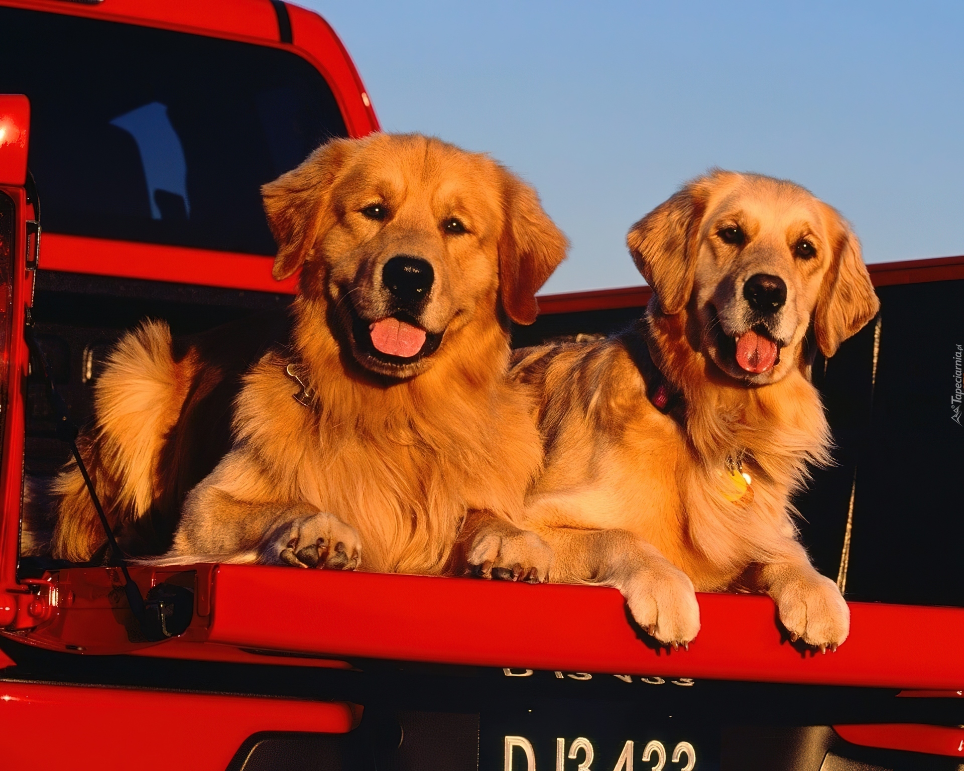 Edytor tapety: Dwa, Pieski, Golden Retriever, Samochód