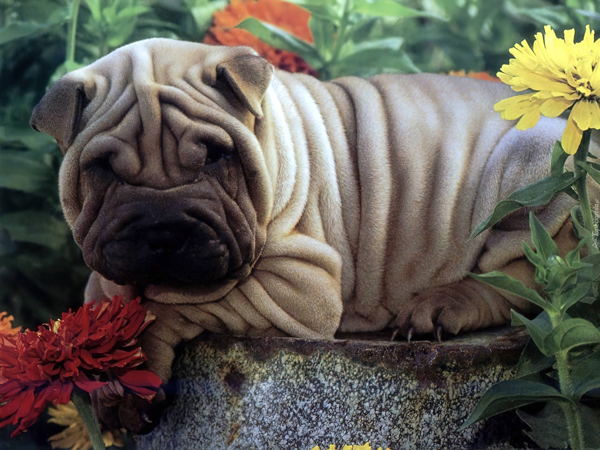 Edytor tapety: Pies, Shar, Pei, Fałdki, Kwiaty