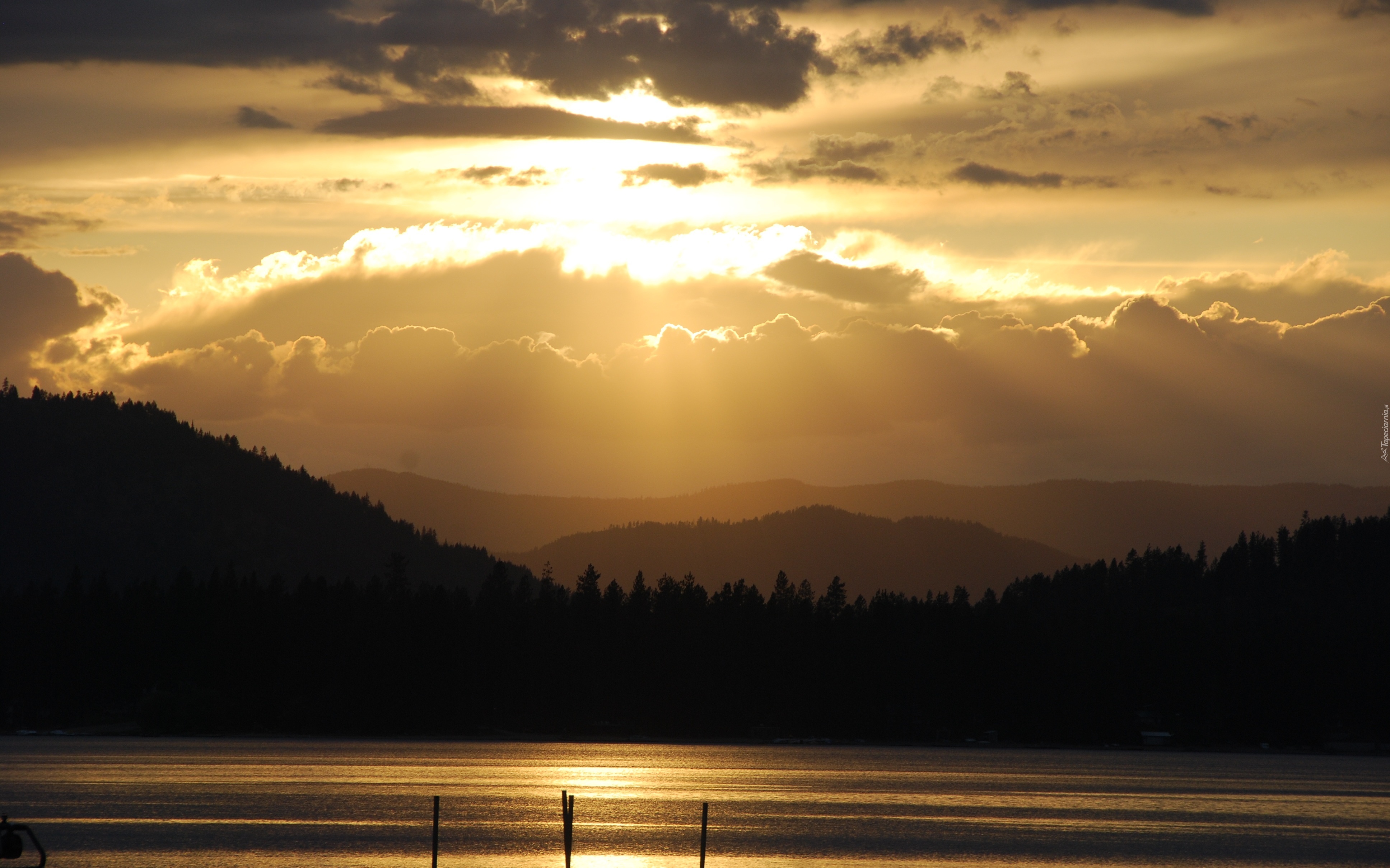 Edytor tapety: Zachód, Słońca, Chmury, Góry, Jezioro