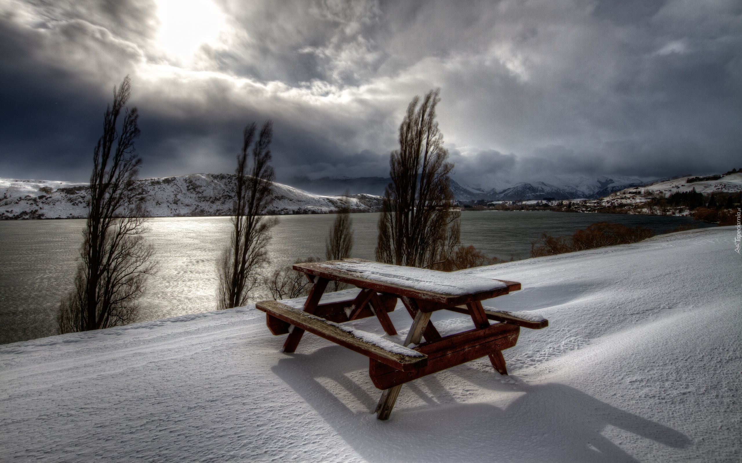 Edytor tapety: Chmury, Góry, Rzeka, Ławka