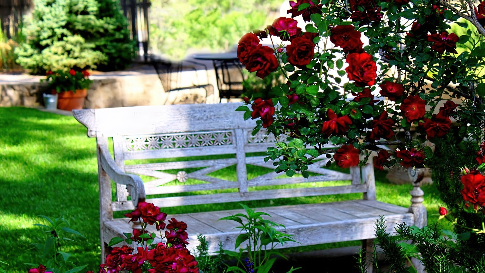Edytor tapety: Róże, Biała, Ławka, Ogród