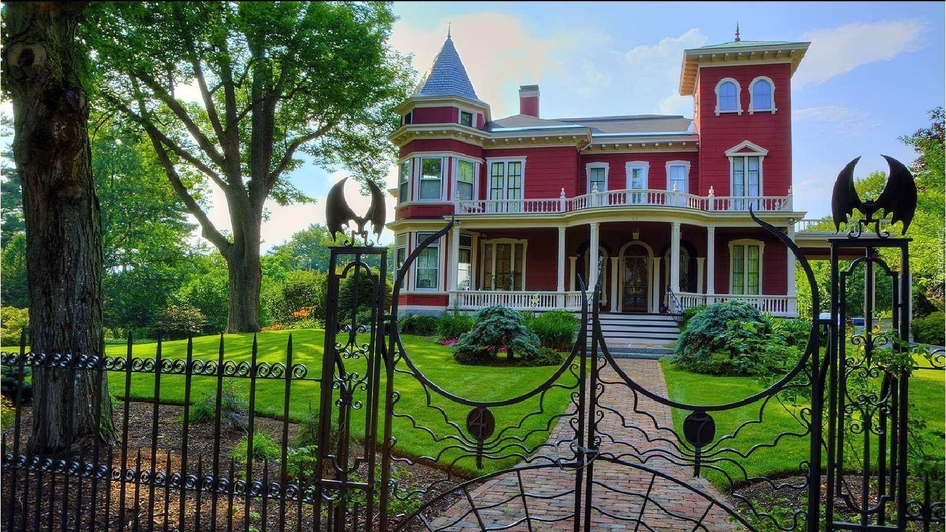 Edytor tapety: Dom, Brama, Drzewa