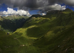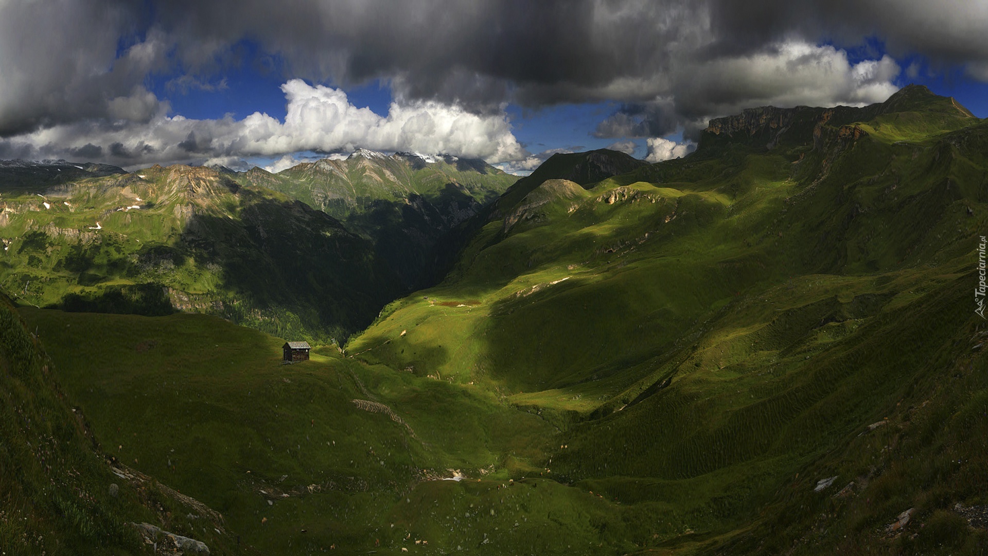 Edytor tapety: Góry, Dolina, Domek, Chmury