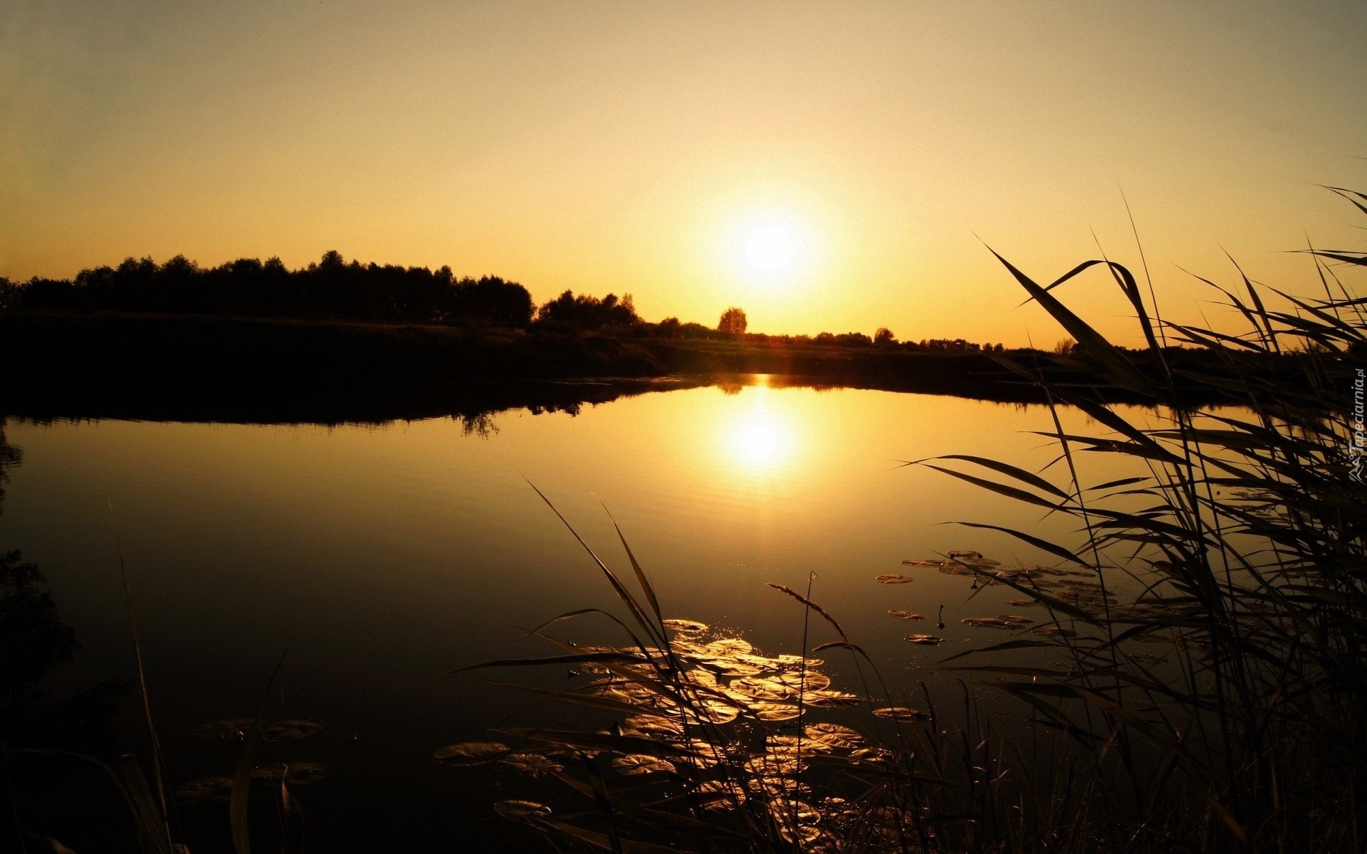 Edytor tapety: Zachód, Słońca, Jezioro, Drzewa